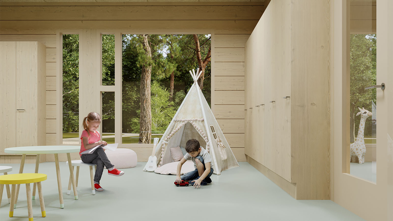 Leppäkorven päiväkoti - havainnekuva hirsipäiväkodin sisätiloista