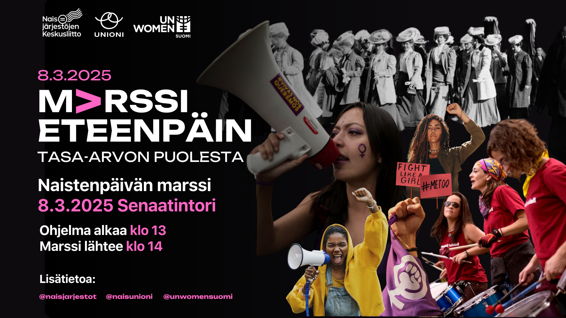 YK:n tasa-arvojärjestö UN Women Suomi, yksi Suomen vanhimmista naisjärjestöistä Naisasialiitto Unioni sekä suomalaisten nais- ja tasa-arvojärjestöjen kattojärjestö Naisjärjestöjen Keskusliitto koordinoivat naistenpäivän marssia, joka tapahtuu Helsingissä kansainvälisenä naistenpäivänä 8.3.2025. Ohjelma alkaa Helsingin Senaatintorilla klo 13, ja marssi lähtee liikkeelle klo 14 kohti Kansalaistoria. Marssilla on mukana jo 100 suomalaista organisaatiota, jotka kaikki marssivat yhteisen viestin takana: tasa-arvon takapakki on pysäytettävä, ja naisten, tyttöjen ja vähemmistöjen oikeuksia on puolustettava. Osallistujia on tulossa eri puolilta Suomea – muun muassa Valkeakoskelta järjestetään bussikuljetus marssille, jota koordinoivat toukokuussa Valkeakoskella tapetun 15-vuotiaan tytön perheenjäsenet.