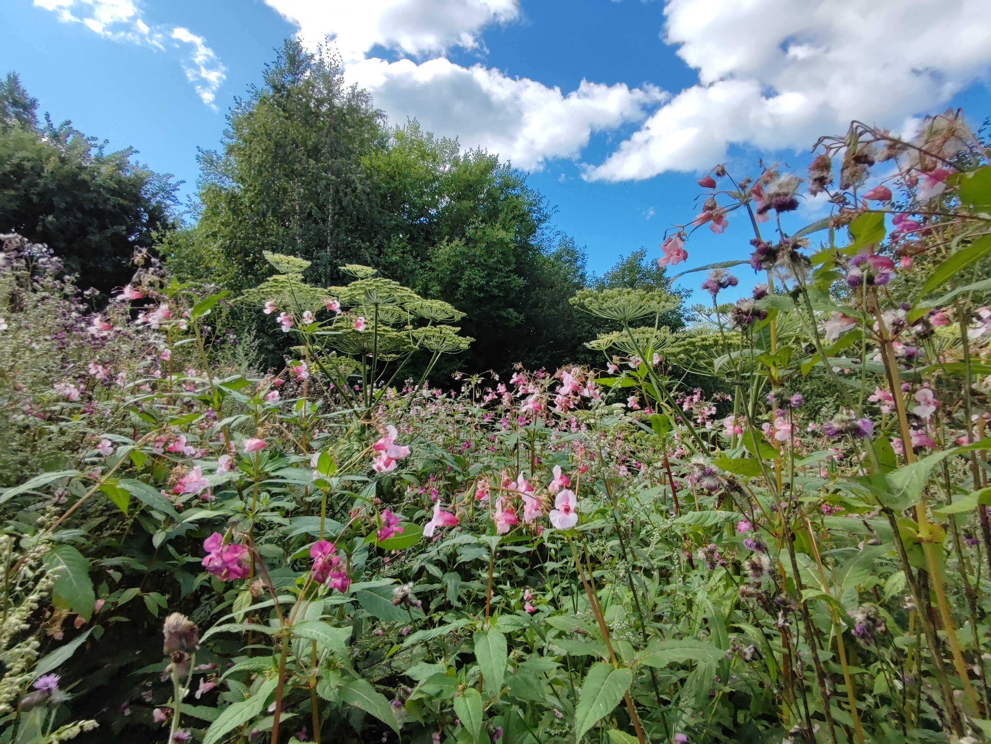 En grönskande äng med jättebalsamin med rosa blommor bland gröna rörväxter. I bakgrunden finns en tät skogsdunge och en delvis molnig blå himmel.