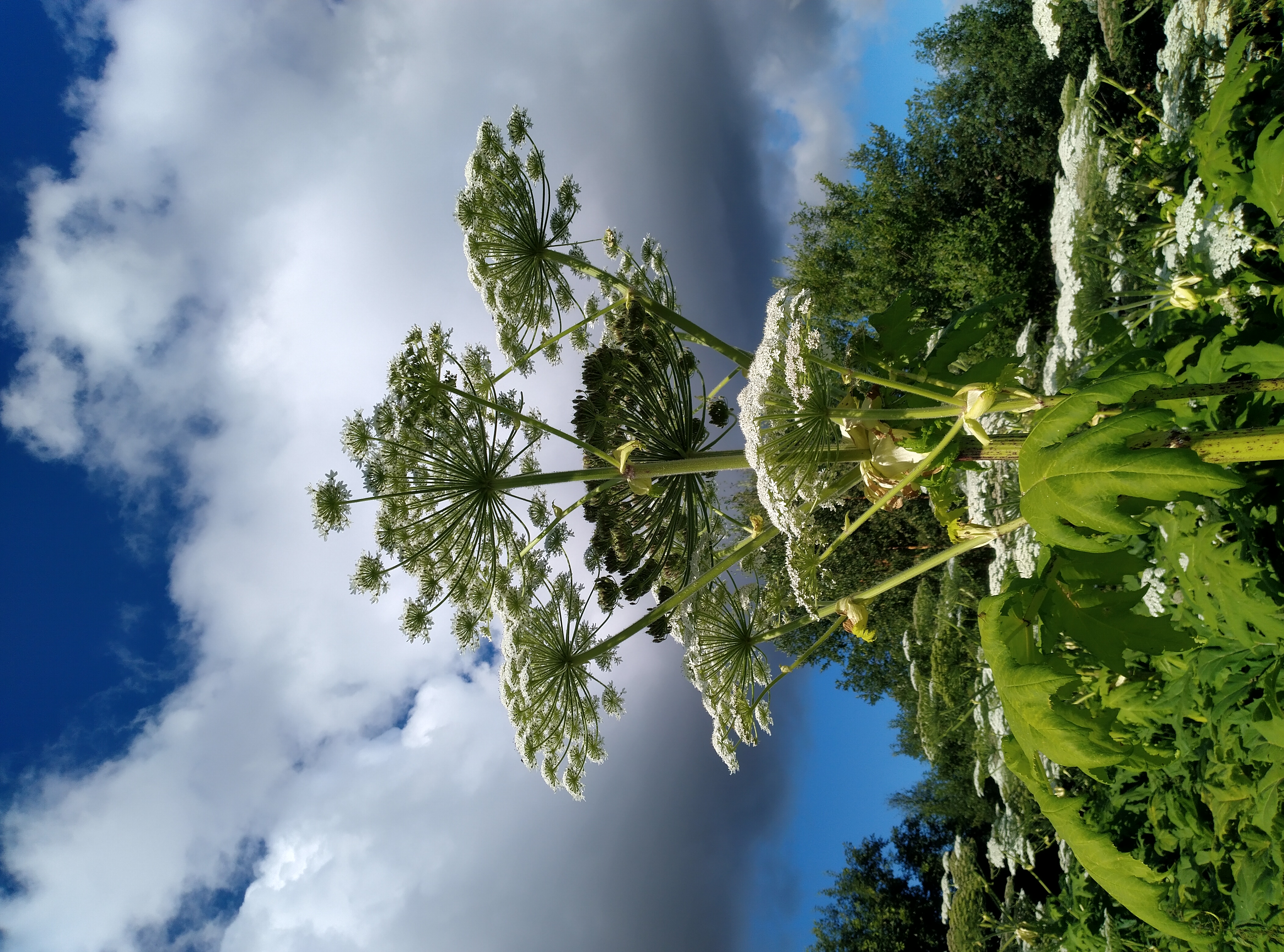 En jätteloka som växer på en naturlig äng. Växten har stora, paraplyformade vita blommor och gröna blad. I bakgrunden finns delvis en molnig blå himmel och grönskande växtlighet.