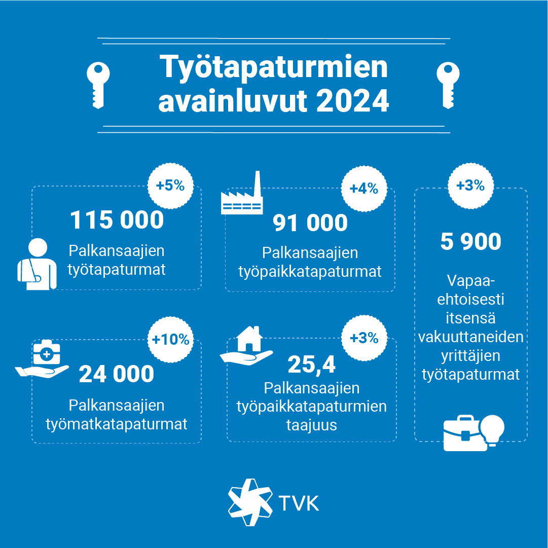Työtapaturmien avainluvut vuonna 2024: 115 000 palkansaajien työtapaturmaa, joista 91 000 työpaikkatapaturmaa ja 24 000 työmatkatapaturmaa. Työpaikkatapaturmataajuus 25,4  miljoonaa tehtyä työtuntia kohden. Itsensä vapaaehtoisesti vakuuttaneille yrittäjille sattui 5 900 työtapaturmaa.