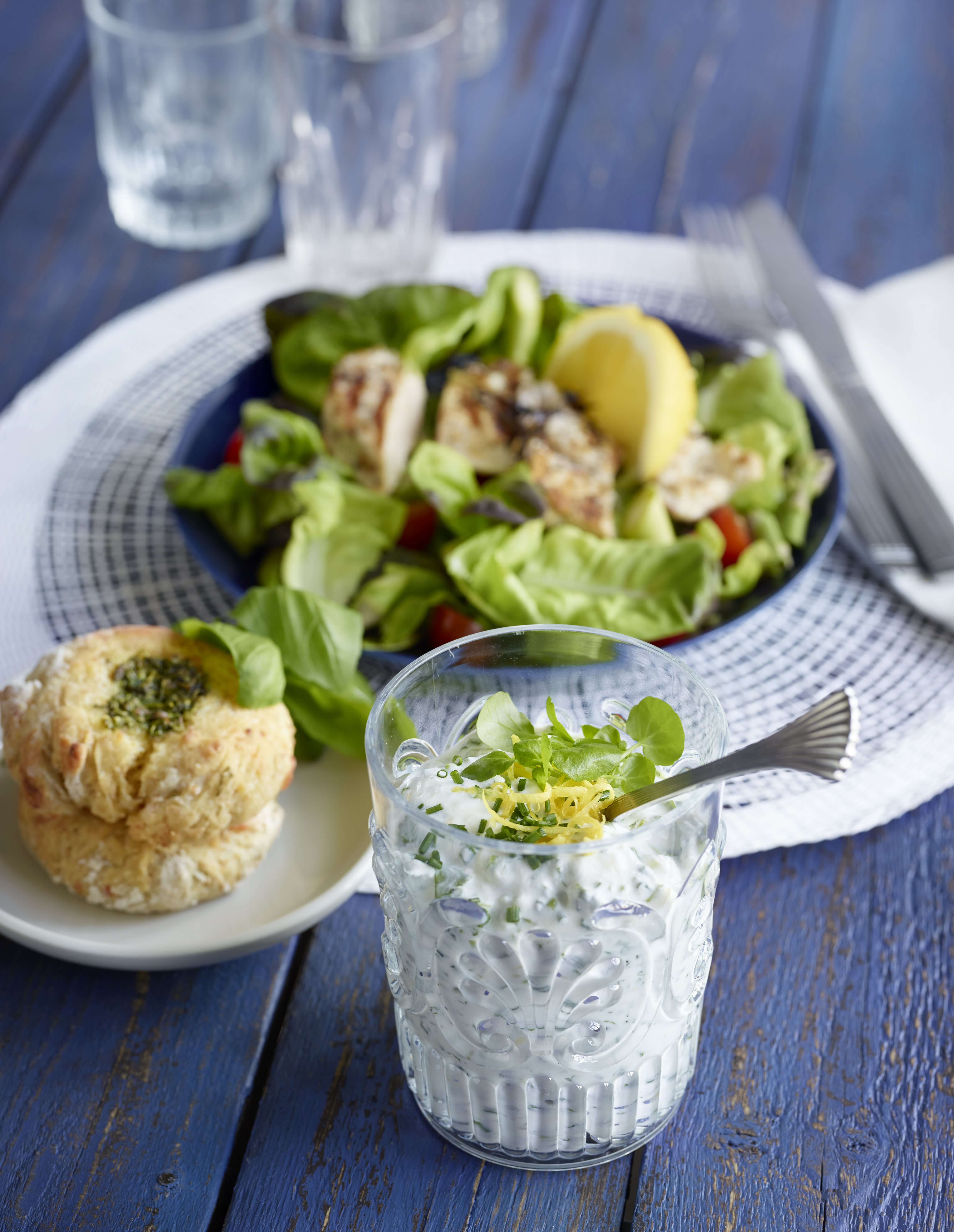 Sekoita jogurtti ja ohueksi raastettu sitruunankuori. Lisää silputtu vesikrassi ja ruohosipuli sekä suola joukkoon. Anna maustua jääkaapissa puolesta tunnista seuraavaan päivään.