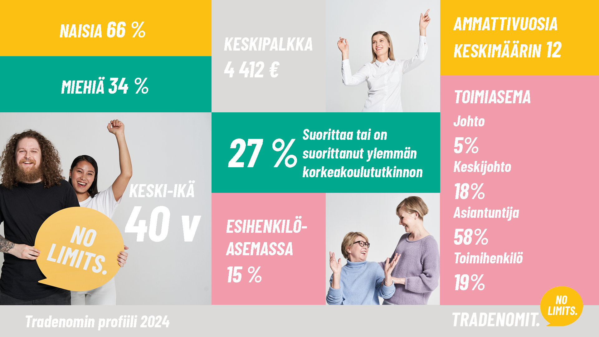 Olemme tutkineet tradenomien palkkausta ja työoloja ainoana liittona Suomessa jo lähes 30 vuotta. Vuotuisen jäsentutkimuksemme tiedonkeruu toteutettiin 30.10.- 31.11.2024 ja siihen vastasi 3112 Tradenomien jäsentä. Tutkimustuloksiin voi tutusta tarkemmin verkkosivuillamme.