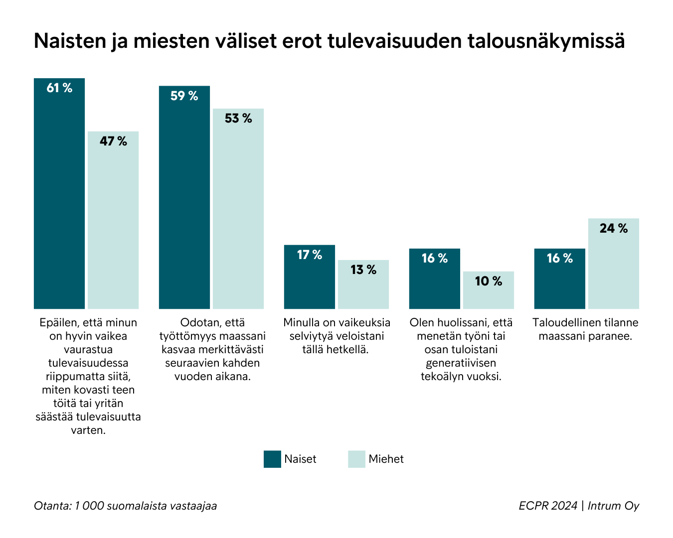 Tutkimuksen mukaan 61 prosenttia suomalaisnaisista arvioi, että heidän on hyvin vaikea vaurastua tulevaisuudessa riippumatta siitä, miten kovasti he tekevät töitä tai yrittävät säästää tulevaisuutta varten. Suomalaismiehistä tätä mieltä oli vain 47 prosenttia. Luotonhallintayhtiö Intrumin vuosittain julkaisema Eurooppalainen kuluttajien maksutaparaportti kokoaa tietoa kuluttajien taloustilanteesta. Tuoreimmassa tutkimuksessa ilmenevillä naisten synkillä näkymillä voi olla moninaisia yhteiskunnallisia vaikutuksia.