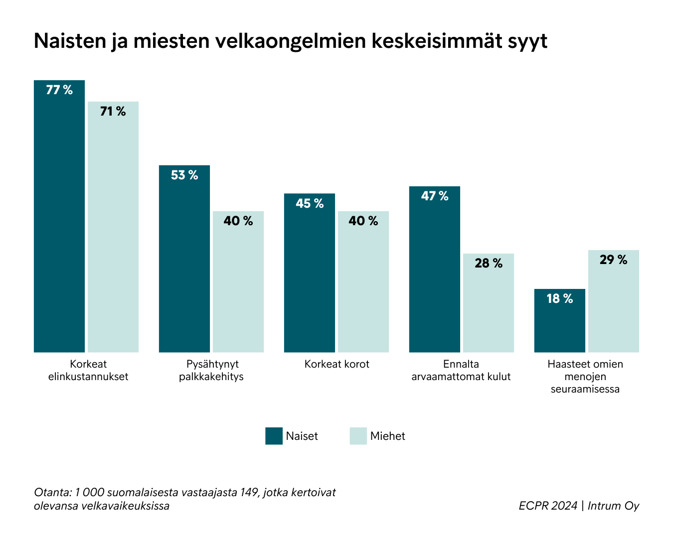 Yleisimmät syyt velkaongelmiin kaikilla vastaajilla olivat korkeat elinkustannukset, pysähtynyt palkkakehitys ja korkeat korot. Suurimmat erot naisten ja miesten velkaongelmien syissä olivat palkkakehityksessä ja ennalta arvaamattomissa kuluissa. Miehet puolestaan mainitsivat naisia useammin velkaongelmien syyksi haasteet omien menojensa seuraamisessa.