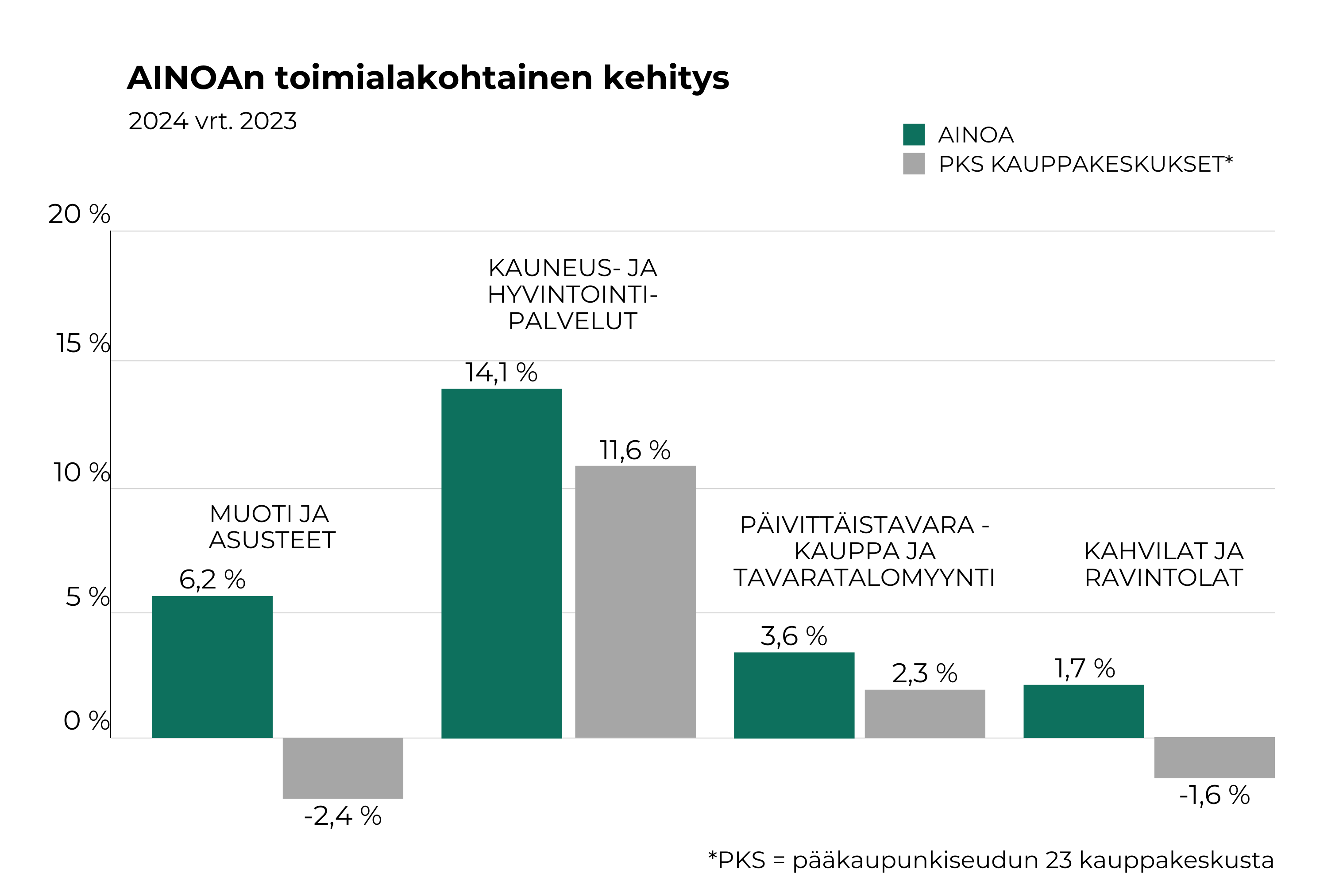 AINOAn kasvu vuonna 2024 näkyi useilla toimialoilla. Muoti ja asusteet, kauneus- ja hyvinvointipalvelut sekä päivittäistavarakauppa kasvoivat kaikki edellisvuodesta. Myös kahvila- ja ravintolatoiminta vahvistui AINOAssa, vaikka toimiala kokonaisuudessaan supistui pääkaupunkiseudun kauppakeskuksissa.