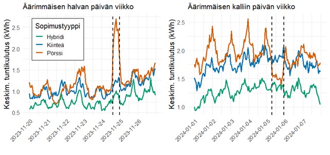 ”Kalliin hinnan päivänä pörssisähkösopimuslaiset vähensivät kulutustaan jopa 38 prosenttia. Hybridisopimuksen omaavat vähensivät myös kulutustaan jonkin verran, noin 7 prosenttia. Halvan hinnan päivänä kulutustaan lisäsivät pelkästään pörssisähkösopimuslaiset. Kiinteähintaisen sopimuksen omaavat kotitaloudet eivät keskimäärin muuttaneet kulutustaan äärihintapäivinä”, Ruokamo sanoo.
