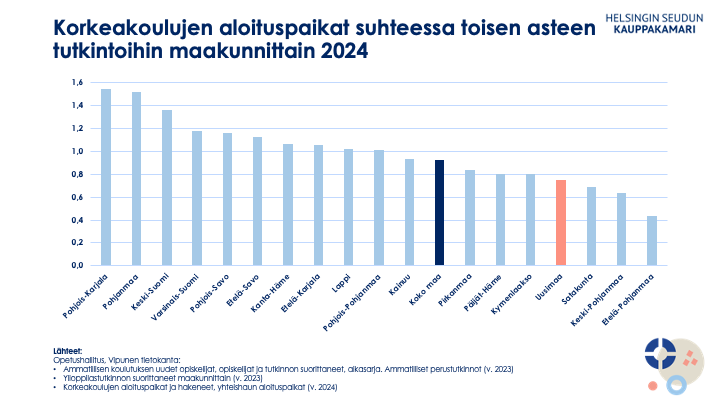 Helsingin seudun kauppakamarin koordinoima Ennakointikamari selvitti ensi kerran Helsingin seudun korkeakoulujen aloituspaikkajakaumaa vuonna 2022. Selvityksen mukaan Uudenmaan korkeakoulujen aloituspaikkojen lukumäärä jäi selvästi muuta Suomea alhaisemmaksi suhteessa alueen toisen asteen tutkinnon suorittaneisiin. Tilanne ei ole korjaantunut.