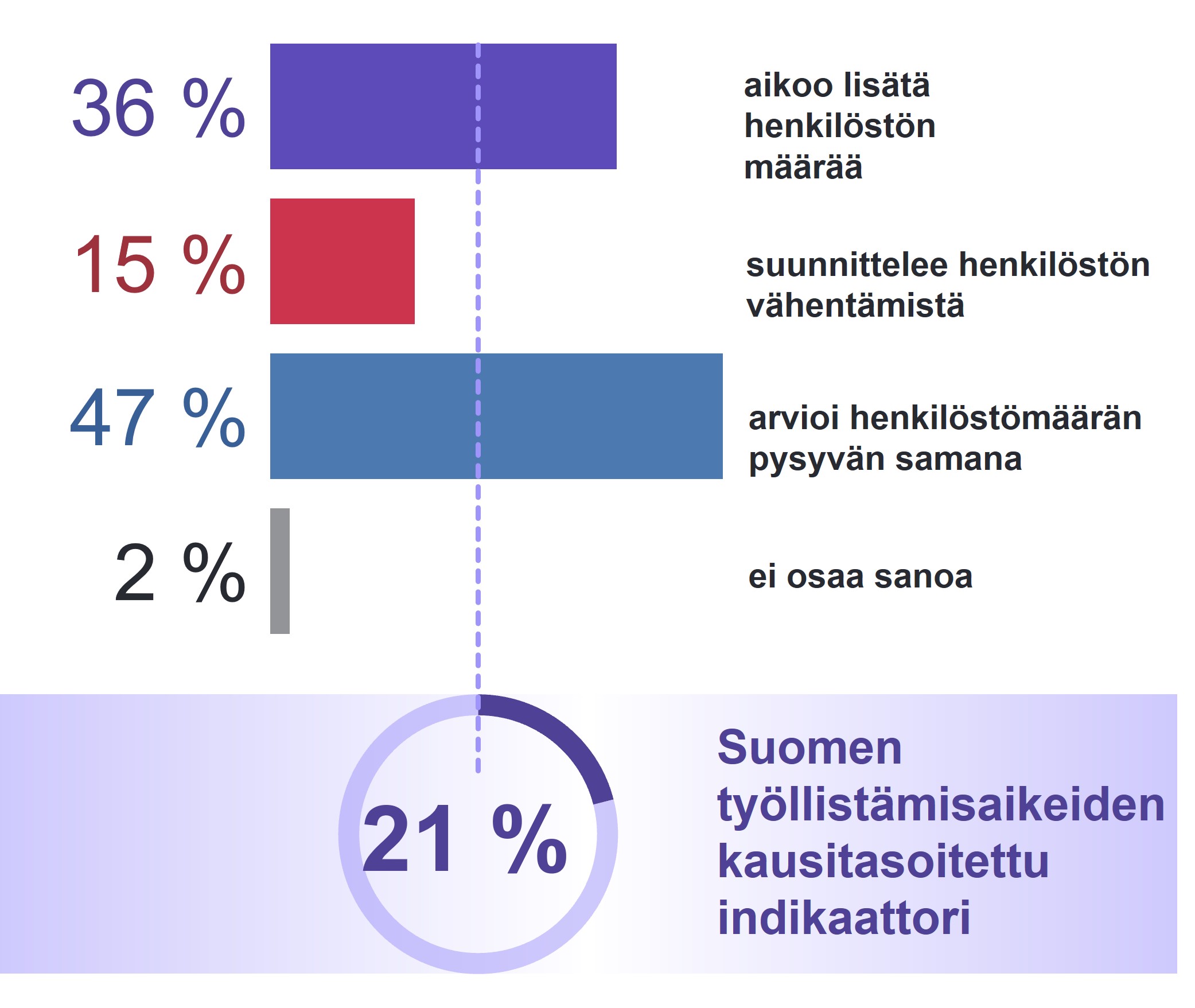 Työnantajien rekrytointiaikeet heikkenevät entisestään. Työnantajien työllistämishalukkuutta kuvaava kausitasoitettu indikaattori on 6 prosenttiyksikköä. Laskua edelliseen vuosineljännekseen on 7 prosenttiyksikköä ja viime vuoden vastaavaan ajanjaksoon 17 prosenttiyksikköä. Globaalisti Suomi sijoittuu työllisyysodotuksissa neljänneksi viimeiseksi, 18 pistettä alle maailman keskiarvon.