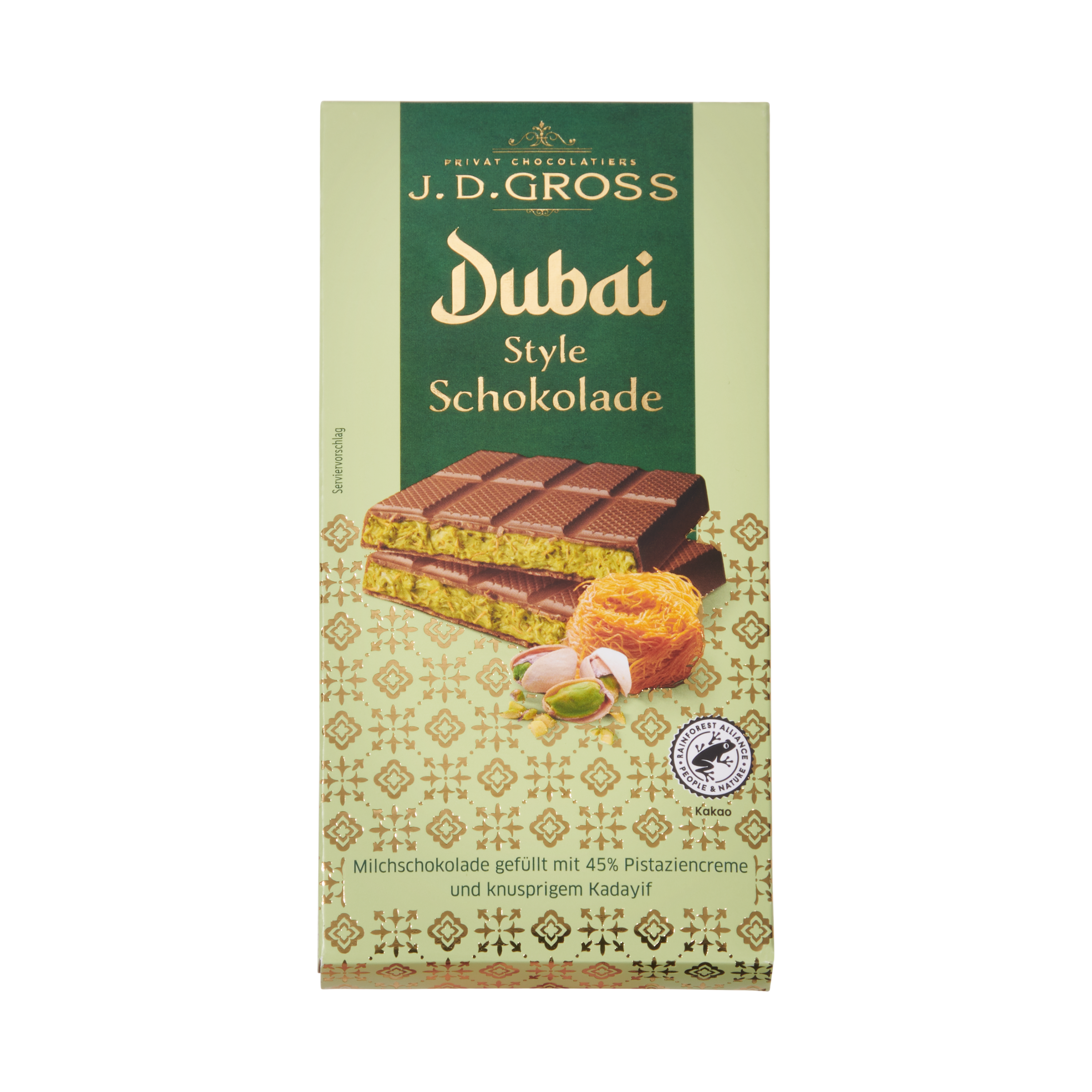 Lidlissä myytävässä Dubai-suklaassa on vähintään 30 prosenttia kaakaota, 12 prosenttia pistaasia ja 5 prosenttia kataifitakinaa. Kataifi on ohutta taikinanauhaa, jota käytetään paljon Lähi-Idässä. Tuotteesta 45 prosenttia on pistaasikreemiä. Yksi levy painaa 126 grammaa ja hinta on 4,99 euroa. Myyntiin tuleva levy on Lidlin omaa J.D.Gross-tuotemerkkiä.