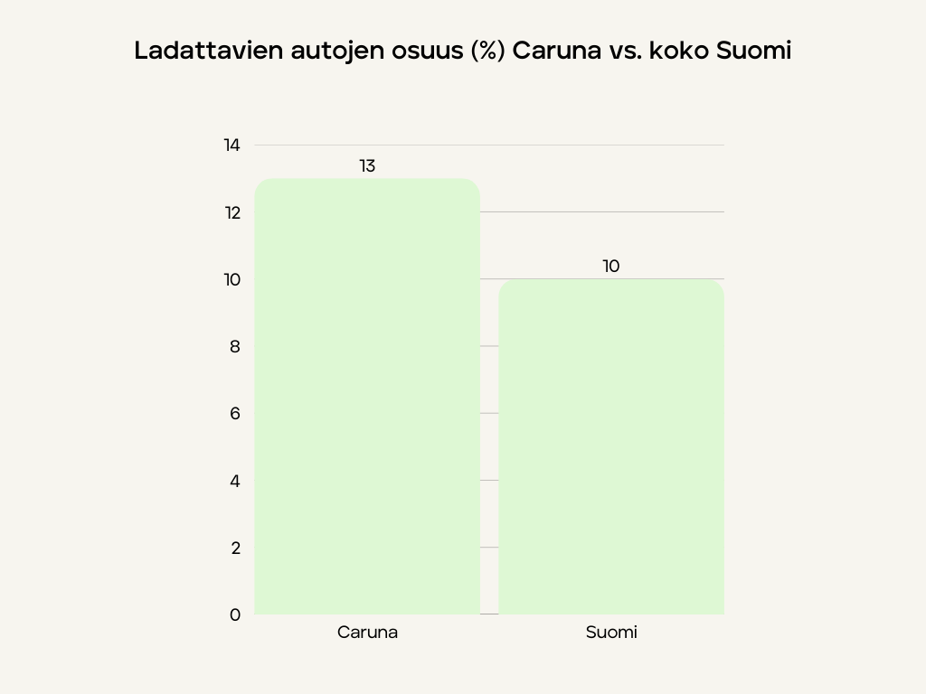 Vuonna 2024 Carunan verkkoalueelle otettiin käyttöön 17 000 uutta ladattavaa autoa, mikä on saman verran kuin edellisenä vuonna. Ladattavien autojen kokonaismäärä on 13 % alueen henkilöautojen kokonaismäärästä. Koko Suomessa vastaava luku on 10 prosenttia. Uusista rekisteröinneistä Carunan verkkoalueen kunnissa 50 % oli ladattavia autoja. Espoossa vastaava luku oli 60 %.
