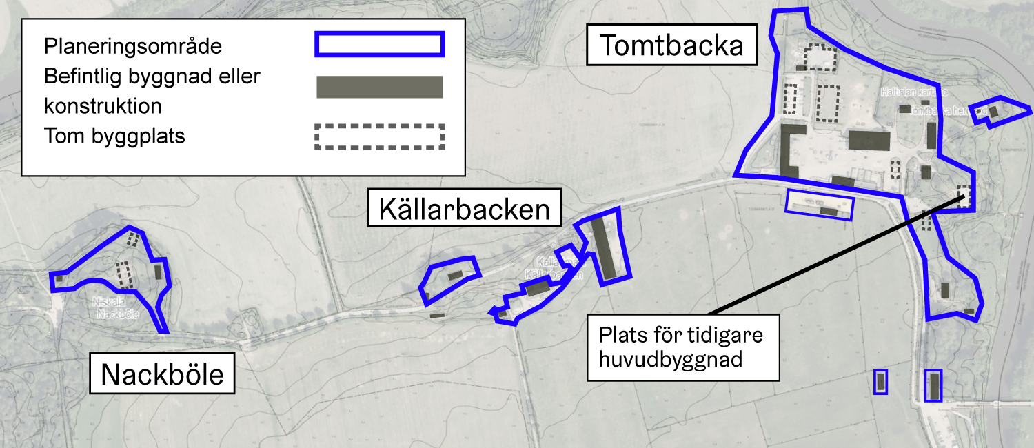 Det finns totalt 29 byggnader/konstruktioner i områdena Tomtbacka, Källarbacken och Nackböle, varav de flesta är skyddade. Dessutom finns det flera byggplatser i Tomtbacka och Nackböle områden. Det är också möjligt att bygga en ny byggnad på platsen för Tomtbacka tidigare huvudbyggnad, men detta bör diskuteras med stadsmuseet.