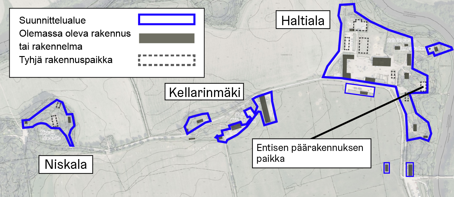 Haltialan, Kellarimäen ja Niskalan alueilla on yhteensä 29 rakennusta/rakennelmaa, joista useimmat ovat suojeltuja. Lisäksi Haltialan ja Niskalan alueilla on useita rakennuspaikkoja. Uuden rakennuksen rakentaminen Haltialan entisen päärakennuksen paikalle on mahdollista, mutta siitä tulee keskustella kaupunginmuseon kanssa.