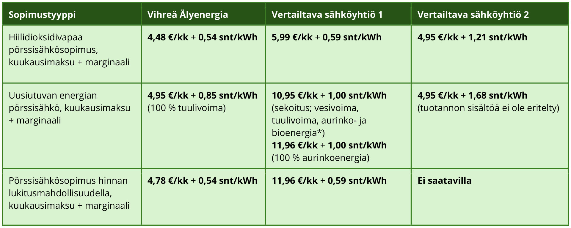 Hiilidioksidivapaa pörssisähkösopimus, kuukausimaksu + marginaali |