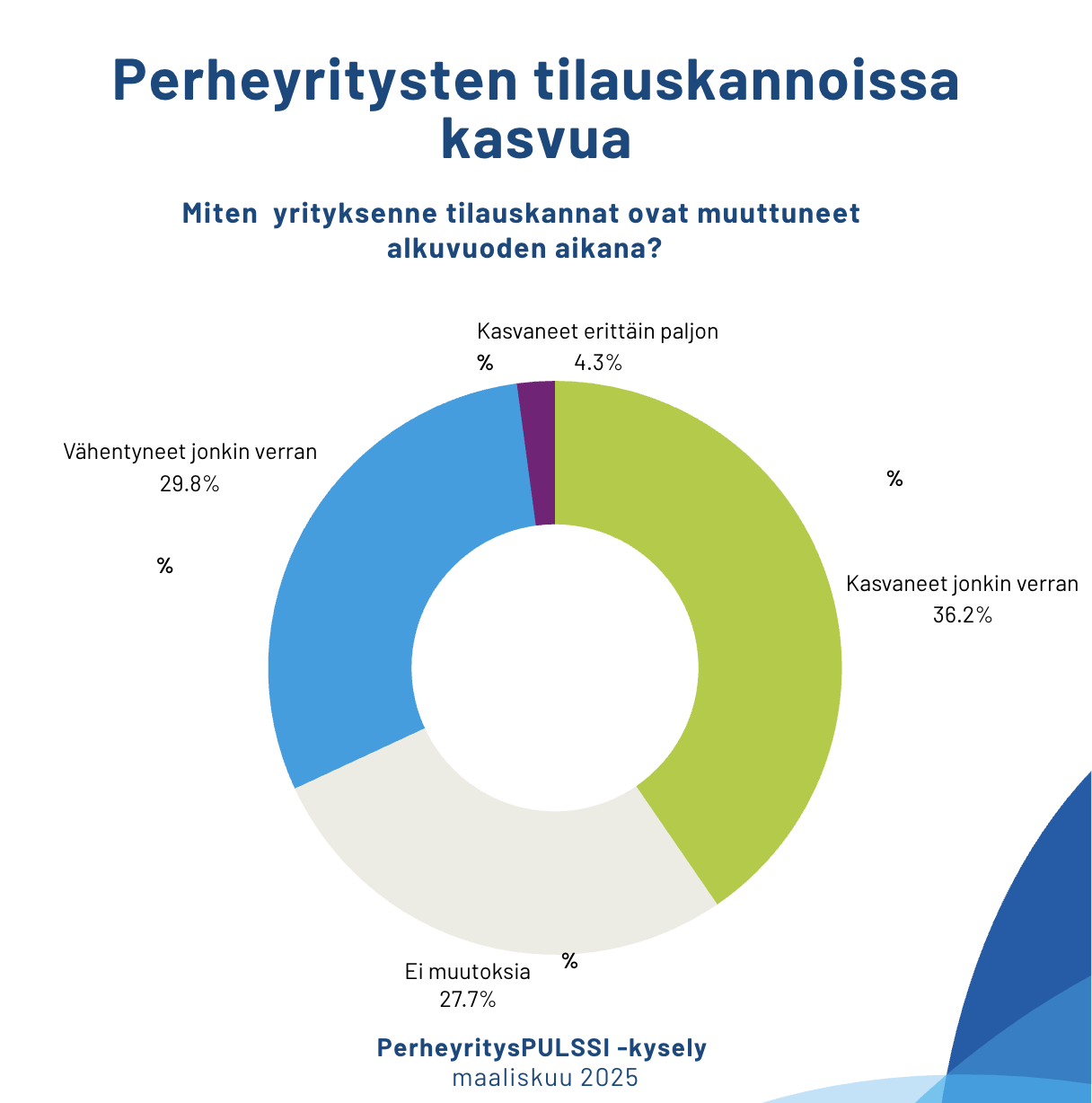 Vanhala-Harmasen mukaan myös perheyritysten tilauskannoissa on tapahtunut myönteistä kehitystä. PULSSIn vastaajayrityksistä 38 prosenttia kertoo, että tilauskannat ovat kasvaneet. Vastaavasti 30 prosenttia perheyrityksistä ilmoittaa tilauskantojen laskusta. Viime syksynä 30 prosenttia vastaajayrityksistä ilmoitti tilauskantojen kasvusta ja jopa 46 prosenttia laskusta.