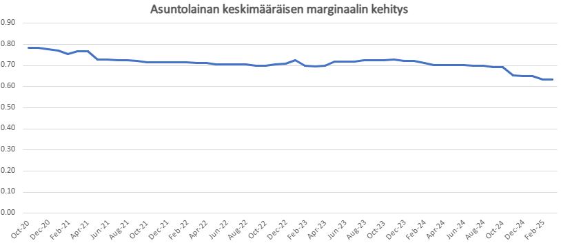 Alta näet kuukausikohtaisen lainamarginaalikehityksen ja tiedotteen liitteenä löydät saman datan myös graafina.