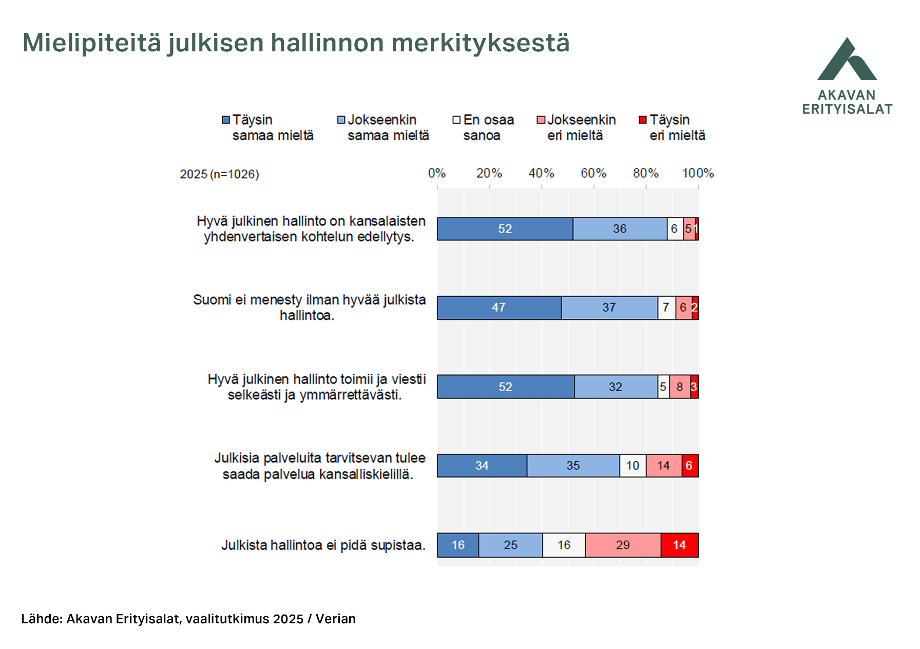Suomi ei menesty ilman hyvää julkista hallintoa, arvioi valtaenemmistö (84 %) suomalaisista. Hallinnon supistamiselle löytyy kuitenkin yhtä paljon kannattajia kuin vastustajiakin. Julkiselta hallinnolta suomalaiset edellyttävät ennen kaikkea osaamista ja lainmukaisuutta. Kyselyn toteutti tammikuussa 2025 tutkimuslaitos Verian Akavan Erityisalojen toimeksiannosta.