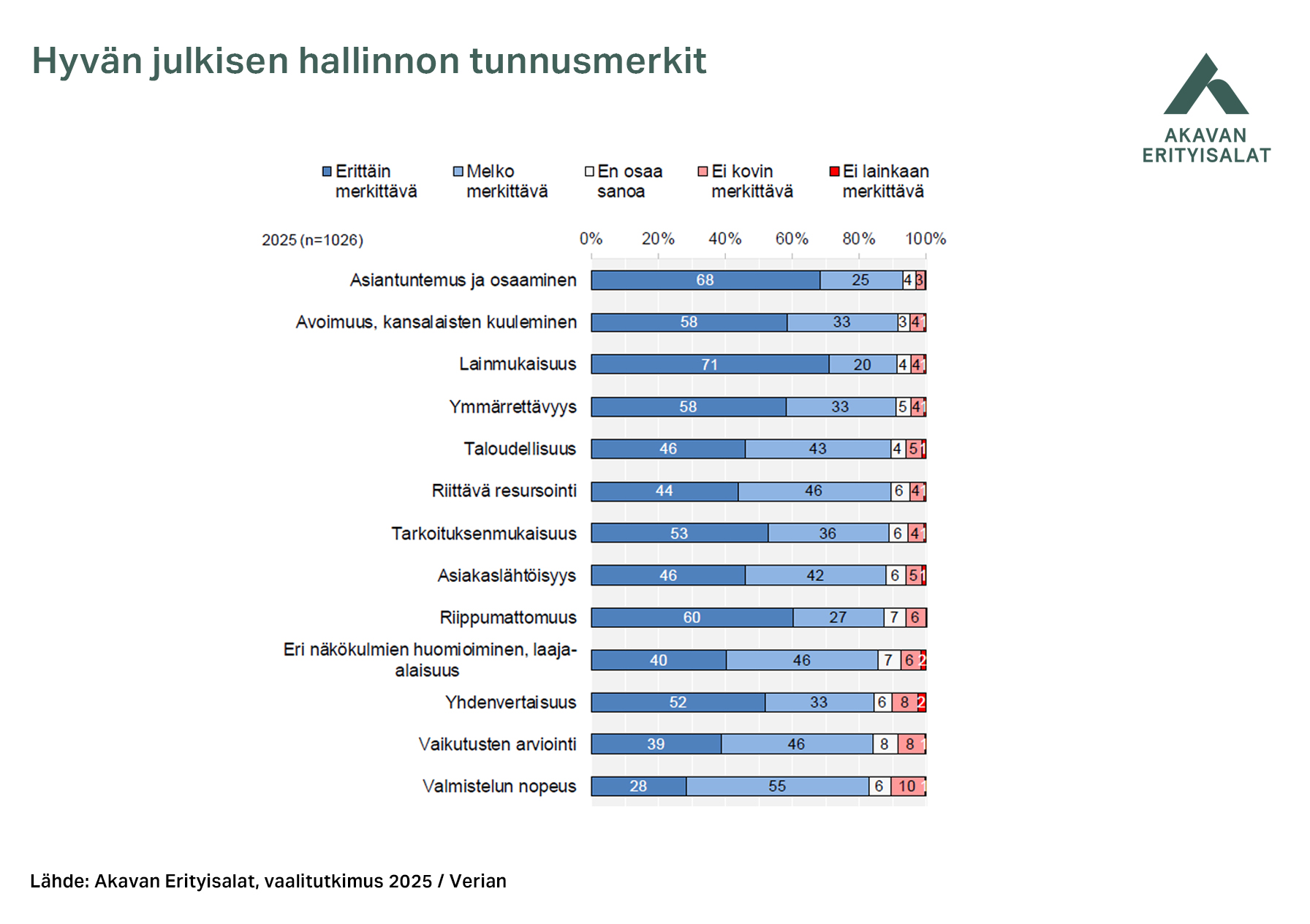 Hyvän hallinnon tunnusmerkeistä vastaajajoukon enemmistö pitää erittäin merkittävinä seitsemää piirrettä. Ne ovat lainmukaisuus, asiantuntemus ja osaaminen, avoimuus ja kansalaisten kuuleminen, riippumattomuus, ymmärrettävyys, tarkoituksenmukaisuus sekä yhdenvertaisuus.