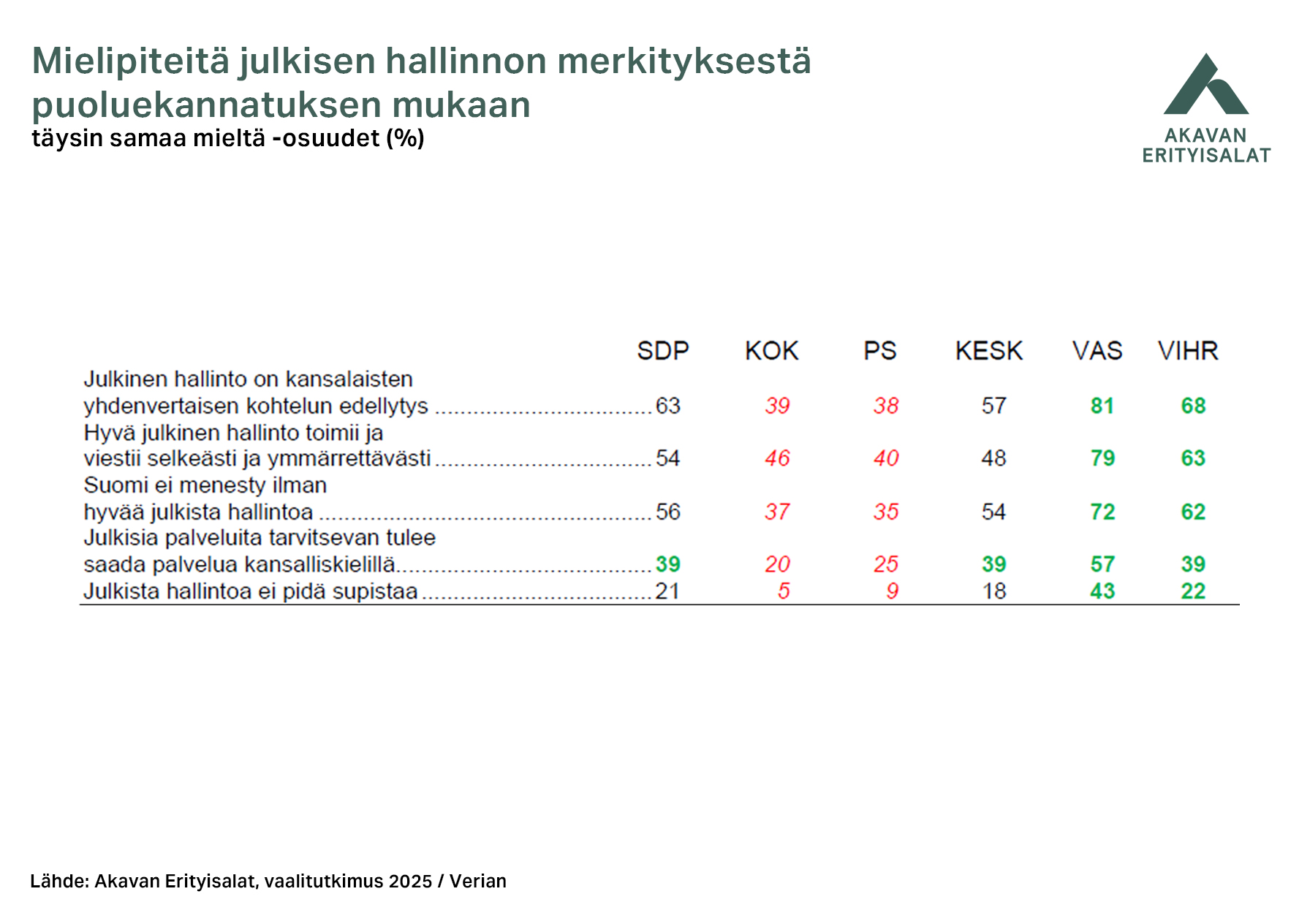 - Mielipiteitä julkisen hallinnon merkityksestä puoluekannatuksen mukaan (täysin samaa mieltä -osuudet)