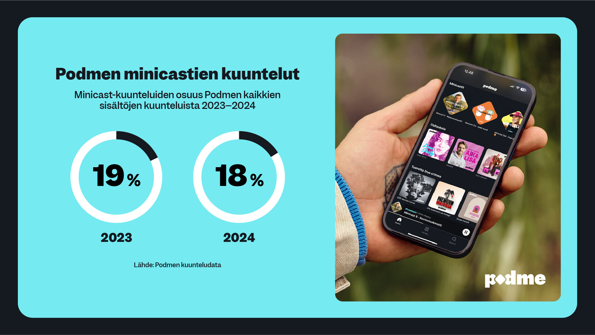 Vuonna 2024 minicastit muodostivat 18 prosenttia kaikista Podmen sisältöjen kuunteluista.