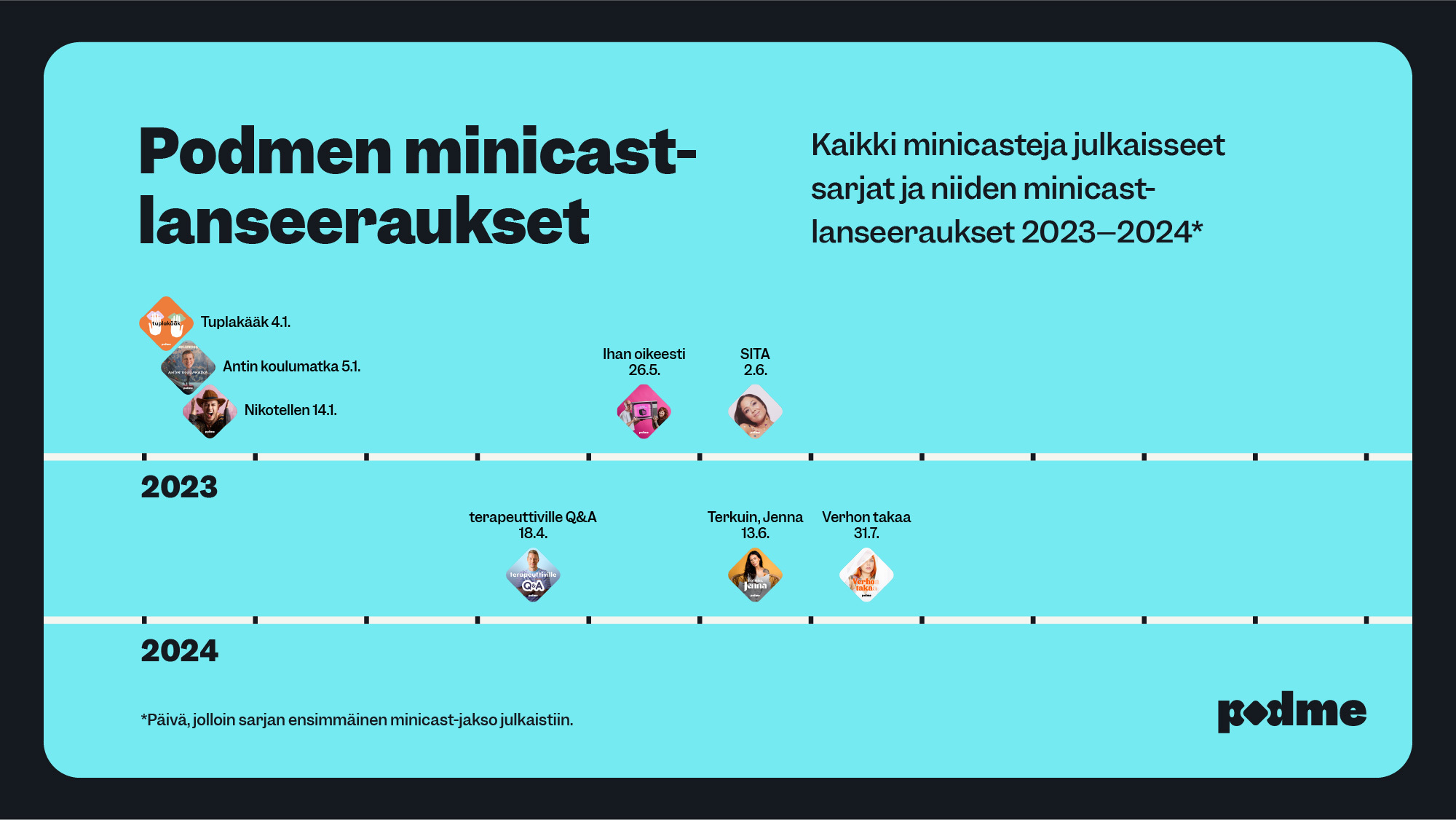 – Suuret kuuntelumäärät sekä palaute minicasteista sisällön muotona olivat meille todella positiivinen yllätys ja siksi niiden määrää on kasvatettu näiden reilun kahden vuoden aikana. Olemme lanseeranneet lisäksi pelkästään minicasteja tekeviä sarjoja, eli päätuotteen ei ole aina pakko olla pidempi podcast, Podme Suomen sisältöjohtaja Ninja Huhtamäki kertoo.