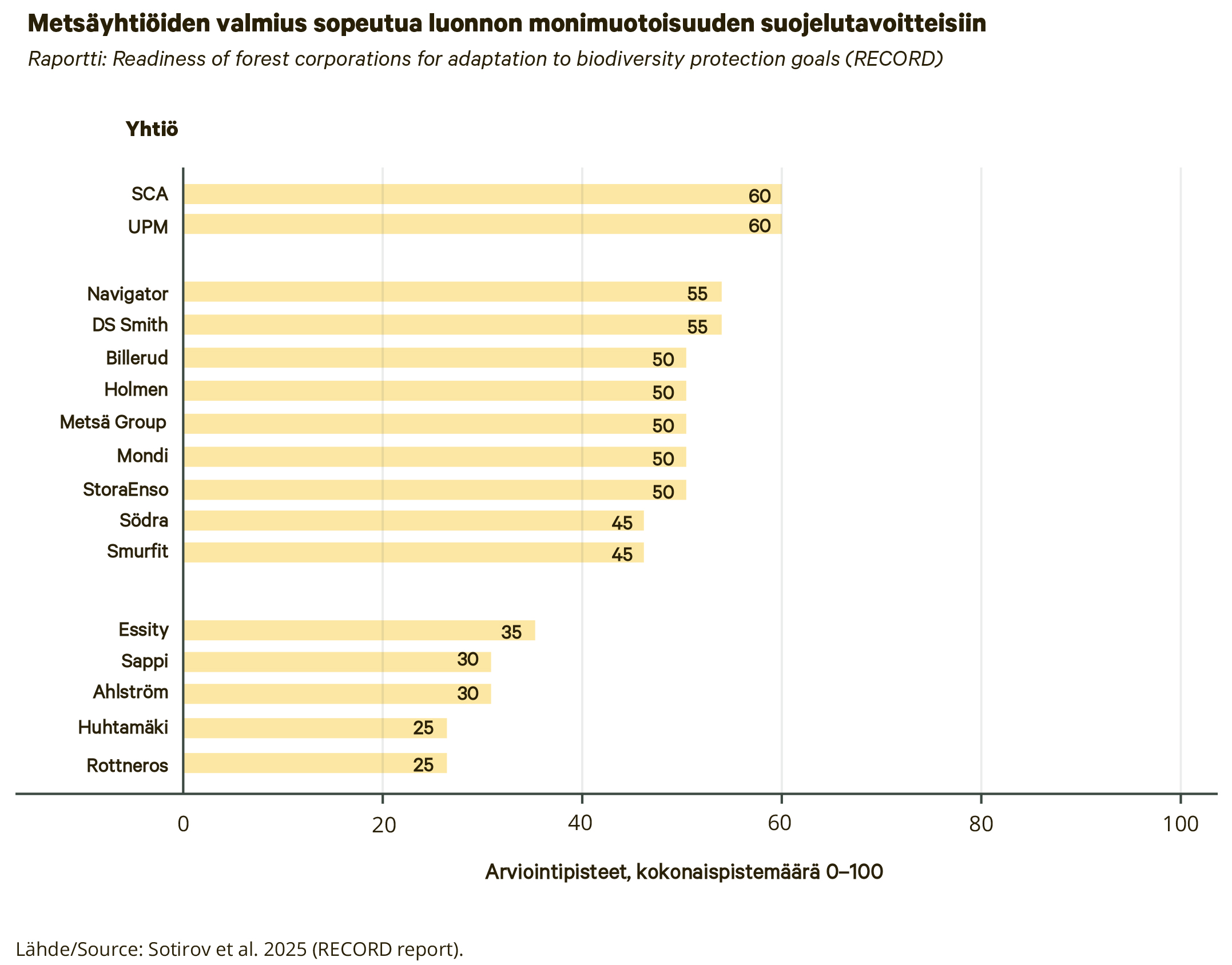Kaksi vertailussa korkeimmalle sijoittunutta yhtiötä, UPM ja SCA, saivat 60 pistettä. Raportin mukaan tästä tuloksesta voi kuitenkin parhaimmillaankin todeta, että yhtiöillä on potentiaalia edetä kohti valmiutta biodiversiteettitavoitteiden täyttämiseen, mutta valmistautuminen on vielä kesken.
