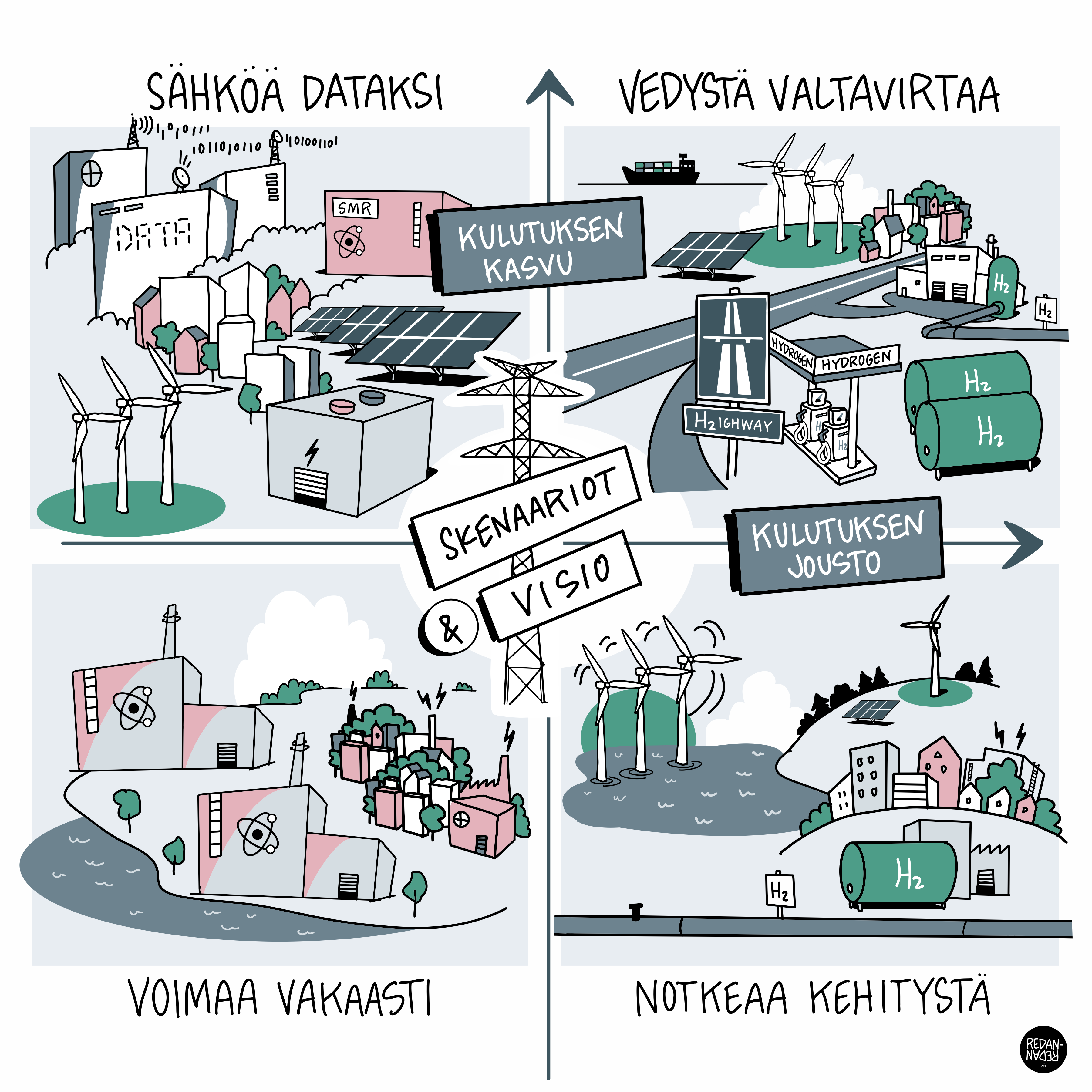 Visiotyötä varten olemme julkaisseet luonnosraportin neljästä erilaisesta tulevaisuusskenaariosta: Sähköä dataksi, Vedystä valtavirtaa, Notkeaa kehitystä ja Voimaa vakaasti. Skenaariot esittävät sähköjärjestelmän mahdollisia kehityspolkuja vuoteen 2040 mennessä. Skenaarioluonnokset on laadittu ottamalla huomioon tuoreimmat yhteiskunnan ja energia-alan signaalit ja niissä tehdyt oletukset on kuvattu kattavasti luonnosraportissa, joka on ladattavissa tiedotteen lopusta. Skenaarioluonnoksista on myös pidetty tänään aiemmin tiedottamamme webinaari, jonka materiaalit ja tallenne tulevat saataville piakkoin.