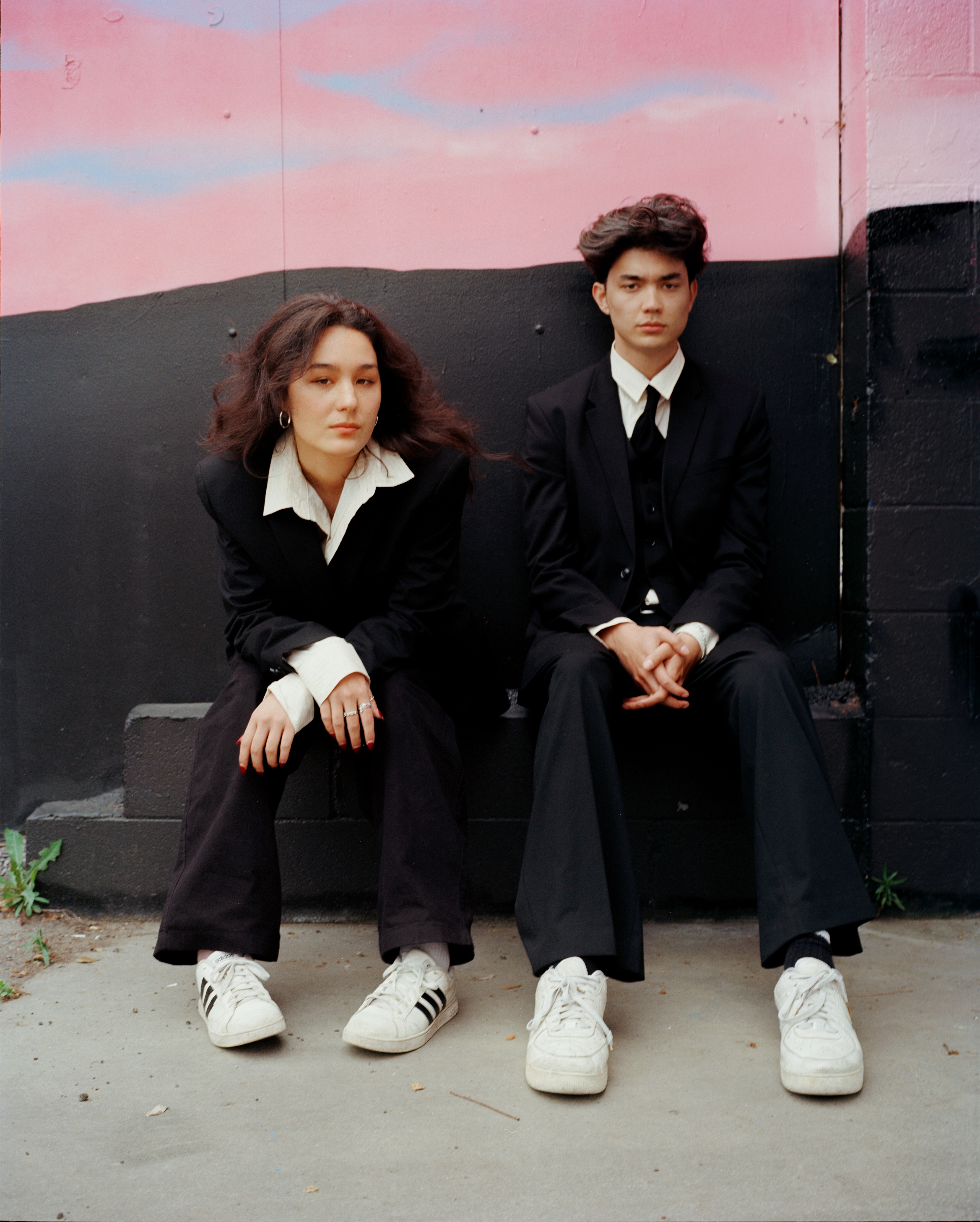 Wasia Projectin Olivia Hardy ja Will Gao istuvat ulkona värikästä seinää vasten. Molemmat ovat pukeutuneet puvuntakkeihin ja -housuihin, valkoisiin kauluspaitoihin ja valkoisiin lenkkitossuihin.