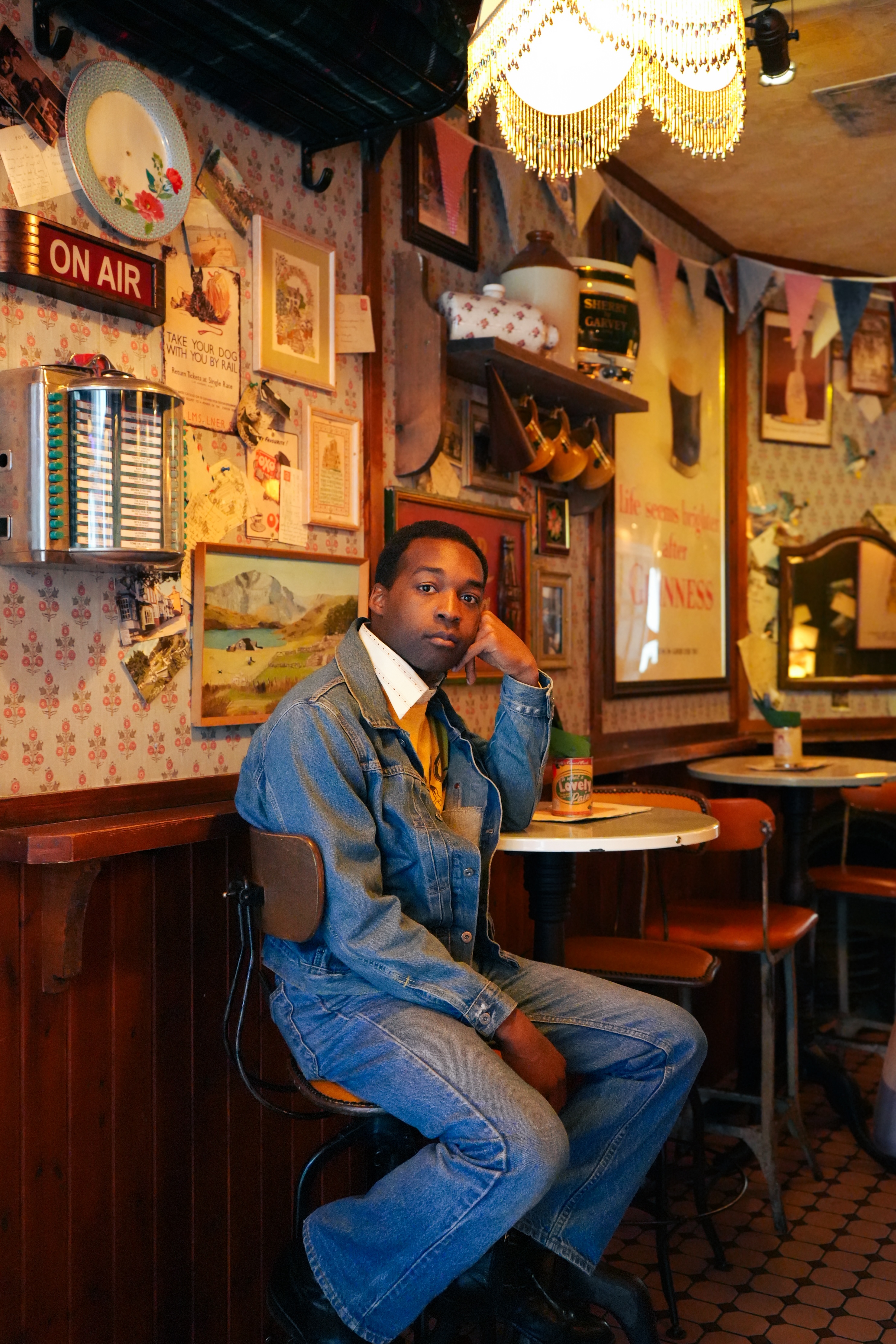 Jalen Ngonda istuu rentoutuneena vintage-tyyliin sijoitetussa baarissa.