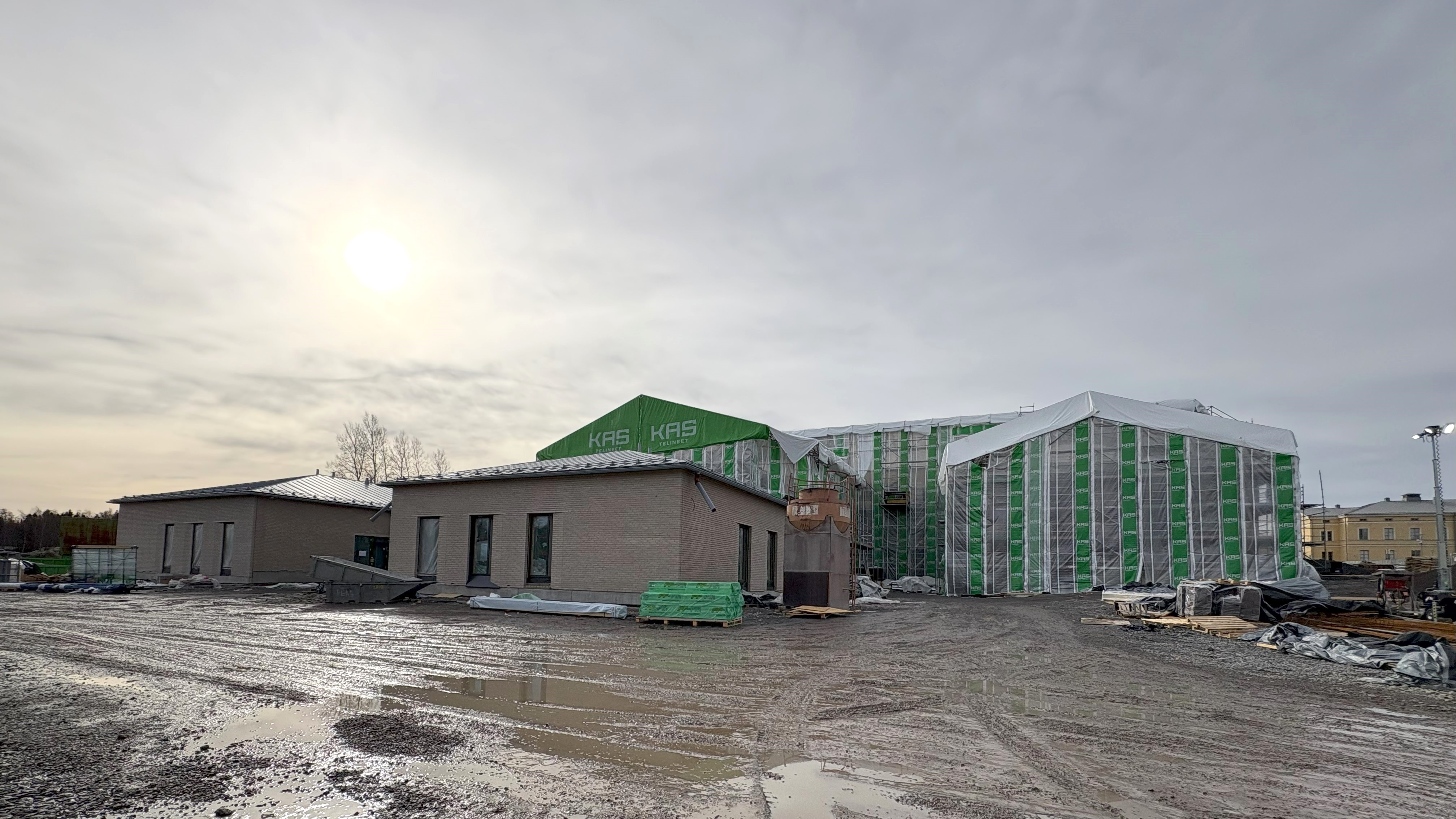 Rakennustyömaa, jossa on keskeneräinen suuri rakennus peitettynä säänsuojalla. Edessä pienempiä, jo valmiimpia rakennuksia. Taustalla pilvinen taivas ja aurinko.