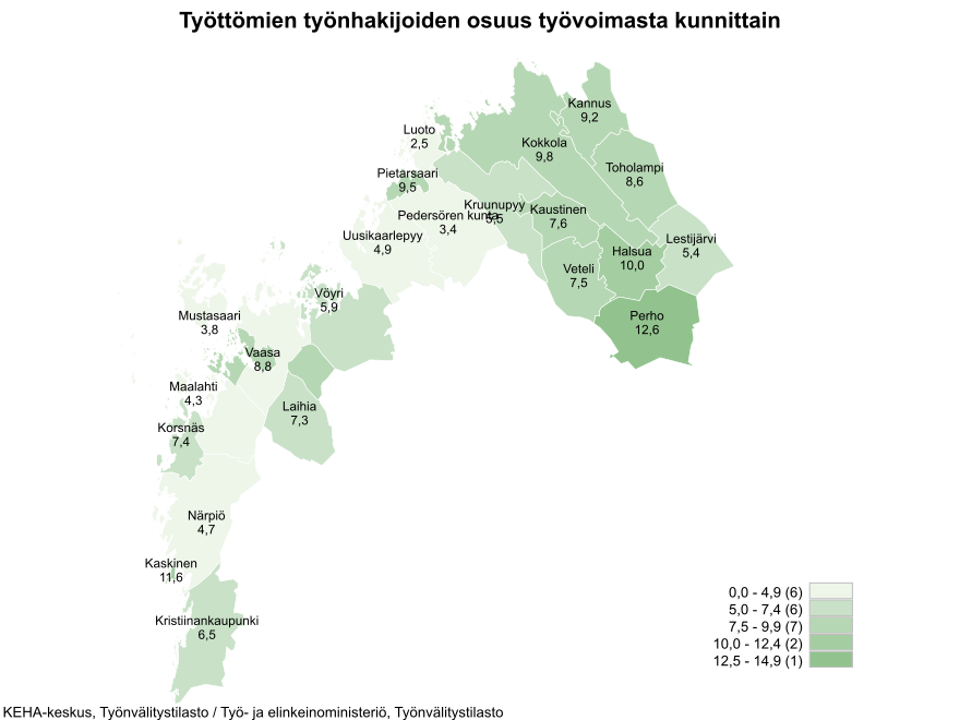 Kunnittain tarkasteltuna työttömyys kasvoi eniten Vaasassa, Kokkolassa ja Pietarsaaressa ja pienentyi eniten Kristiinankaupungissa, Mustasaaressa ja Kannuksessa. Perhossa työttömyysaste oli alueen korkein (12,6 %), kun taas Luodossa alhaisin (2,5 %). Vaasan työttömyysaste oli 8,8 %, Pietarsaaren 9,5 % ja Kokkolan 9,8 %.