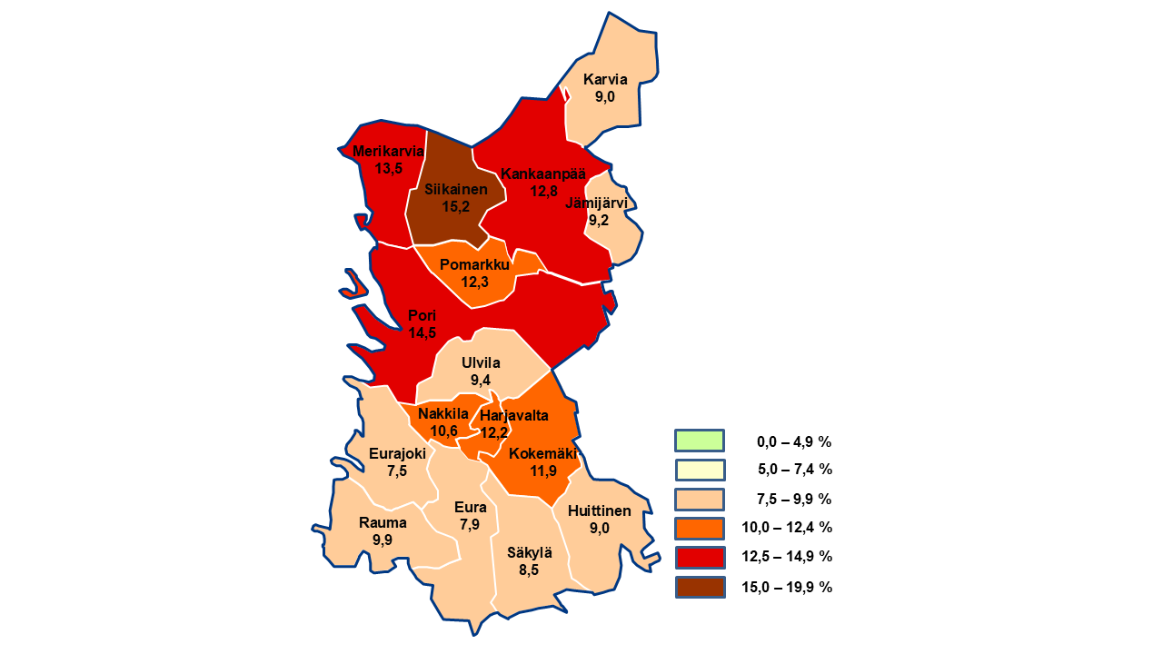 Helmikuussa työttömyys oli korkeinta Siikaisissa, jossa työttömien työnhakijoiden osuus työvoimasta oli 15,2 %. Alin työttömyys oli Eurajoella (7,5 %).