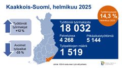 Kaakkois-Suomessa oli helmikuun lopussa 18032 työtöntä työnhakijaa. Työttömien määrä on 1939 henkilöä (+12 %) suurempi kuin vuotta aikaisemmin. Koko maassa kasvua oli 13 prosenttia.