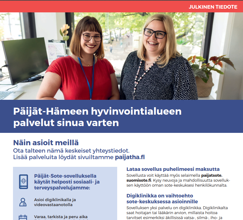 Hyvinvointialueen sivuilta löytyvät palvelujen tarkemmat kuvaukset ja yhteystiedot. Alue- ja kuntavaalitietoutta samoin kuin paperiesitteen löytää sähköisenä osoitteesta paijatha.fi/vaalit2025.