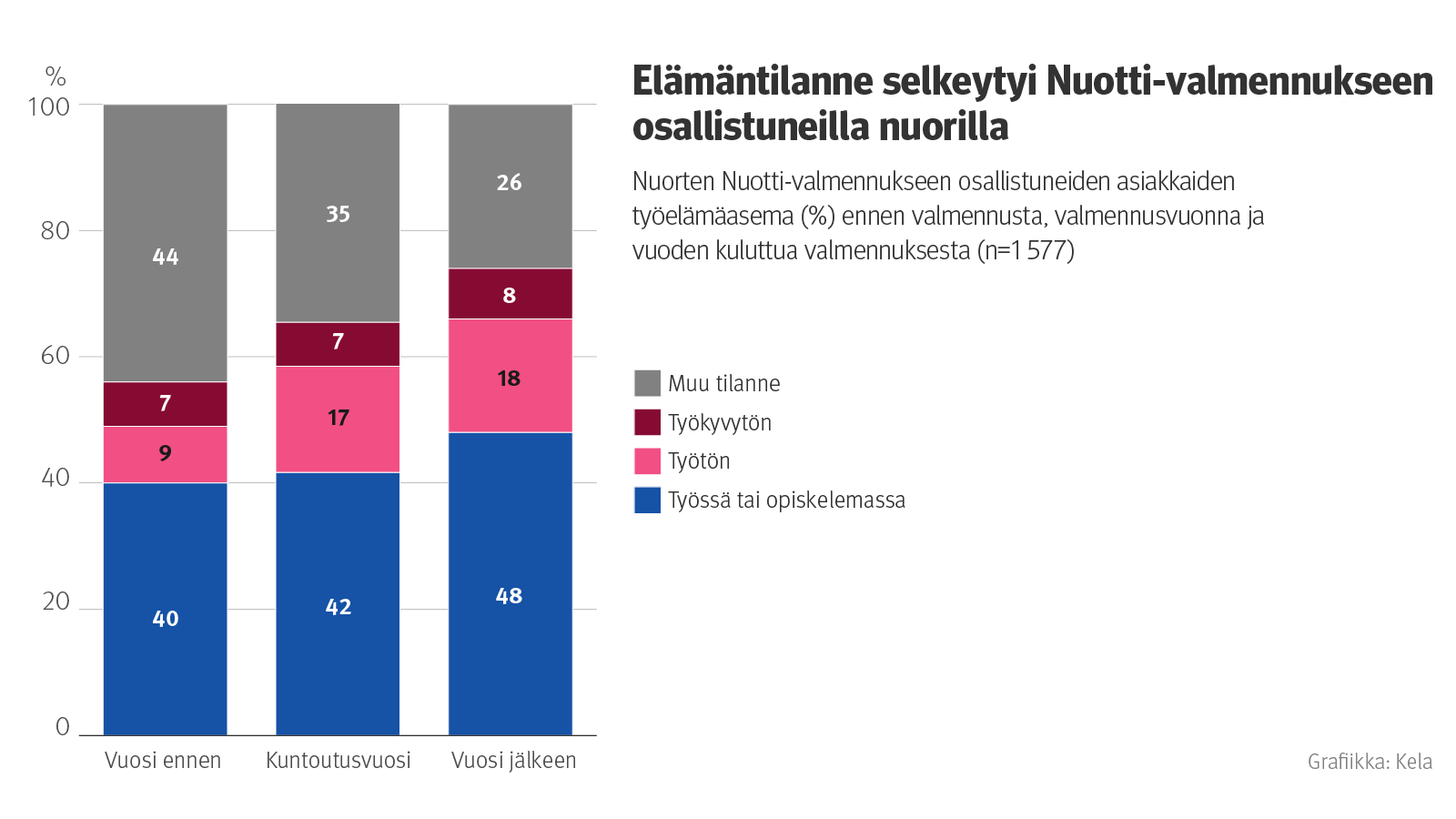 Nuotti-valmennuksen päätti vuonna 2021 noin 3 600 nuorta, joiden työ- ja opiskelukyky oli heikentynyt. Lähes puolet heistä oli vuoden kuluttua työssä tai opiskelemassa. Samaan aikaan työkyvyttömien osuus pysyi pienenä ja työttömien osuus laski hieman.