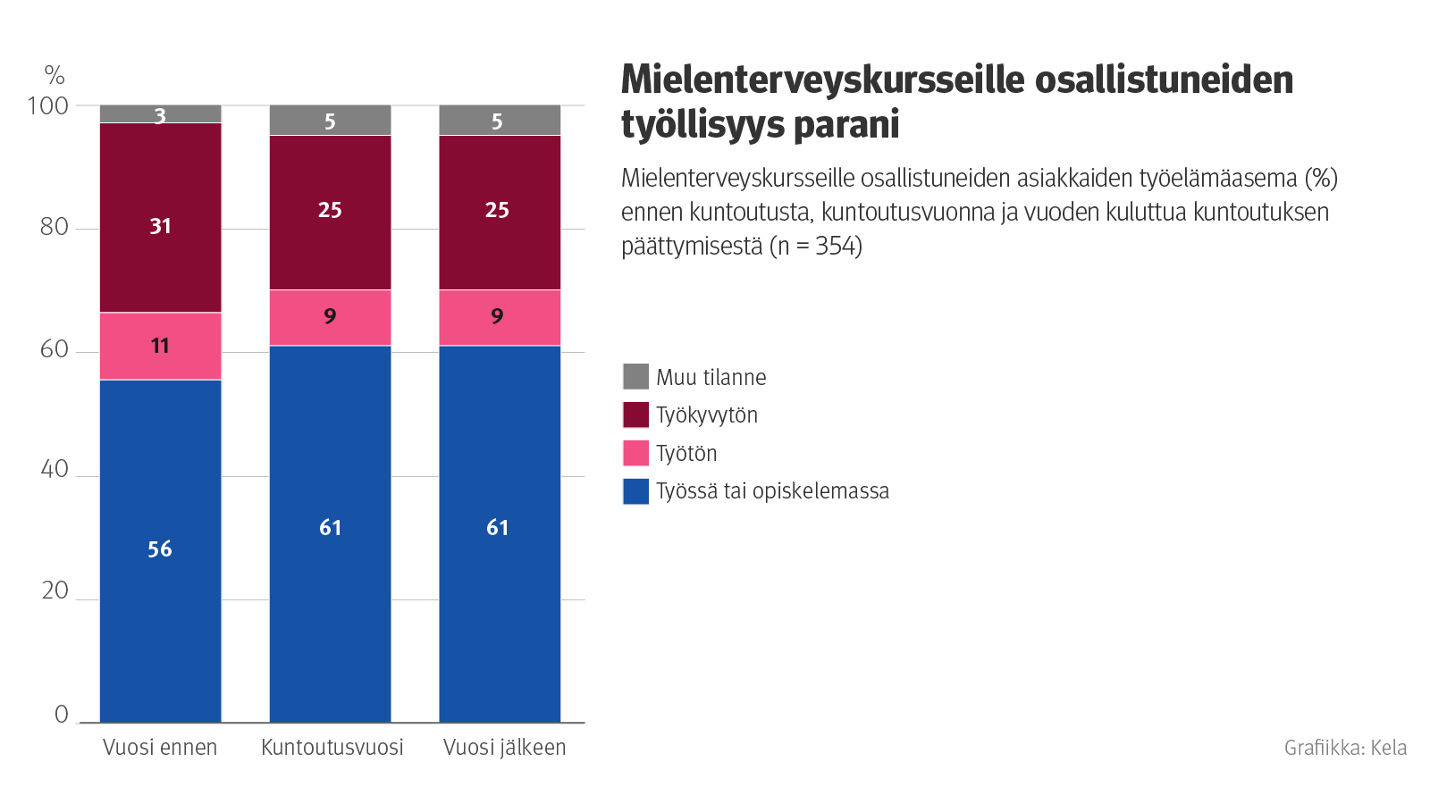 Vuotta ennen kuntoutusta mielenterveyskurssille osallistuneista työssä tai opiskelemassa oli 56 prosenttia, vuotta kurssin jälkeen 61 prosenttia. Samalla työkyvyttömien osuus väheni kuntoutujilla 31 prosentista 25 prosenttiin. Mielenterveyskurssin päätti vuonna 2021 noin 800 henkilöä.