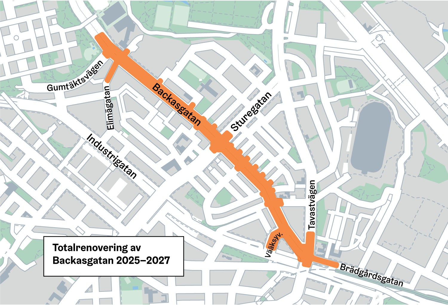 Helsingfors stad totalrenoverar Backasgatan mellan Tavastvägen och Gumtäktsvägen. I entreprenaden förnyas den gamla kommunaltekniken och trafikarrangemangen på gatorna blir allt tryggare och beaktar alla färdsätt. Dessutom förnyas gatuträd. Arbetena pågår i cirka två år.