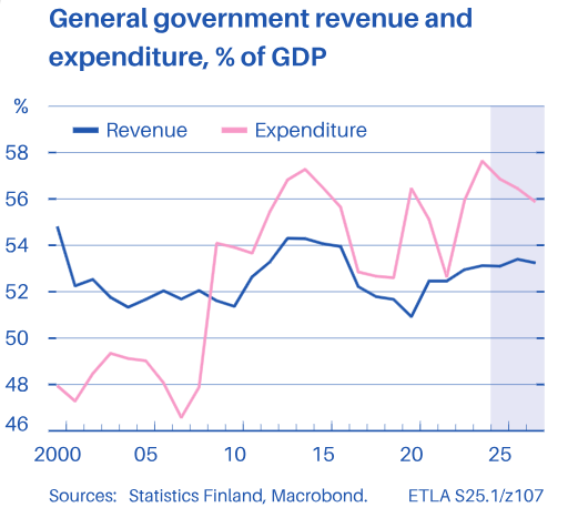 Finland's public expenditure as a share of the total economy reached a record high of almost 58% last year. This year, the general government deficit will remain around 4% of GDP and will not fall below the 3% threshold until 2027. By then, the debt-to-GDP ratio will approach 87%.