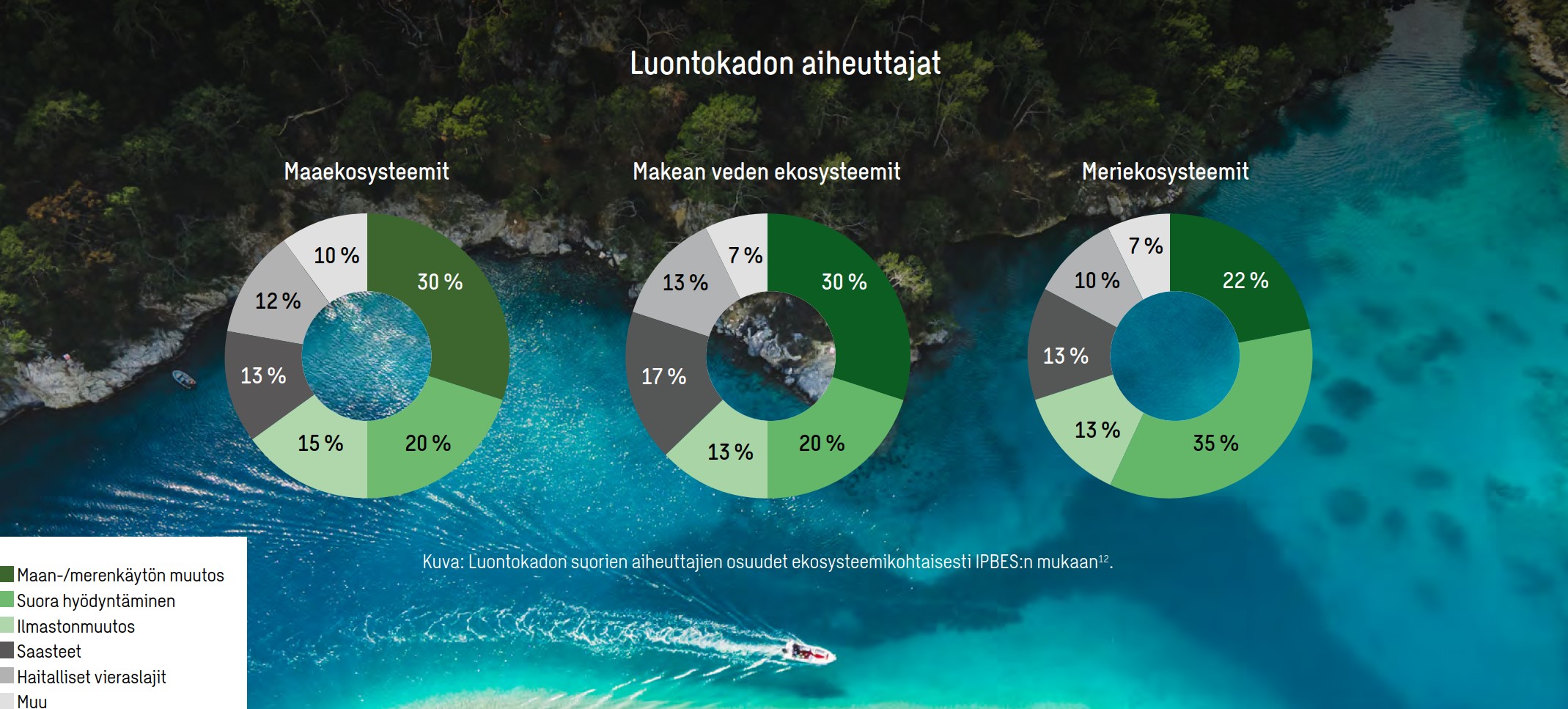 Yli miljoona lajia on tällä hetkellä sukupuuton partaalla, ja luonnon monimuotoisuuden jatkuva väheneminen uhkaa ekosysteemejä, yhteiskuntia ja yrityksiä. Luontokadon syinä ovat maankäyttö, luonnonvarojen ylikulutus, ilmastonmuutos, saasteet ja vieraslajien leviäminen. Yli 75 % maapallon pinta-alasta ja 66 % merien pinta-alasta on muutettu huomattavasti ihmisen toimesta.
