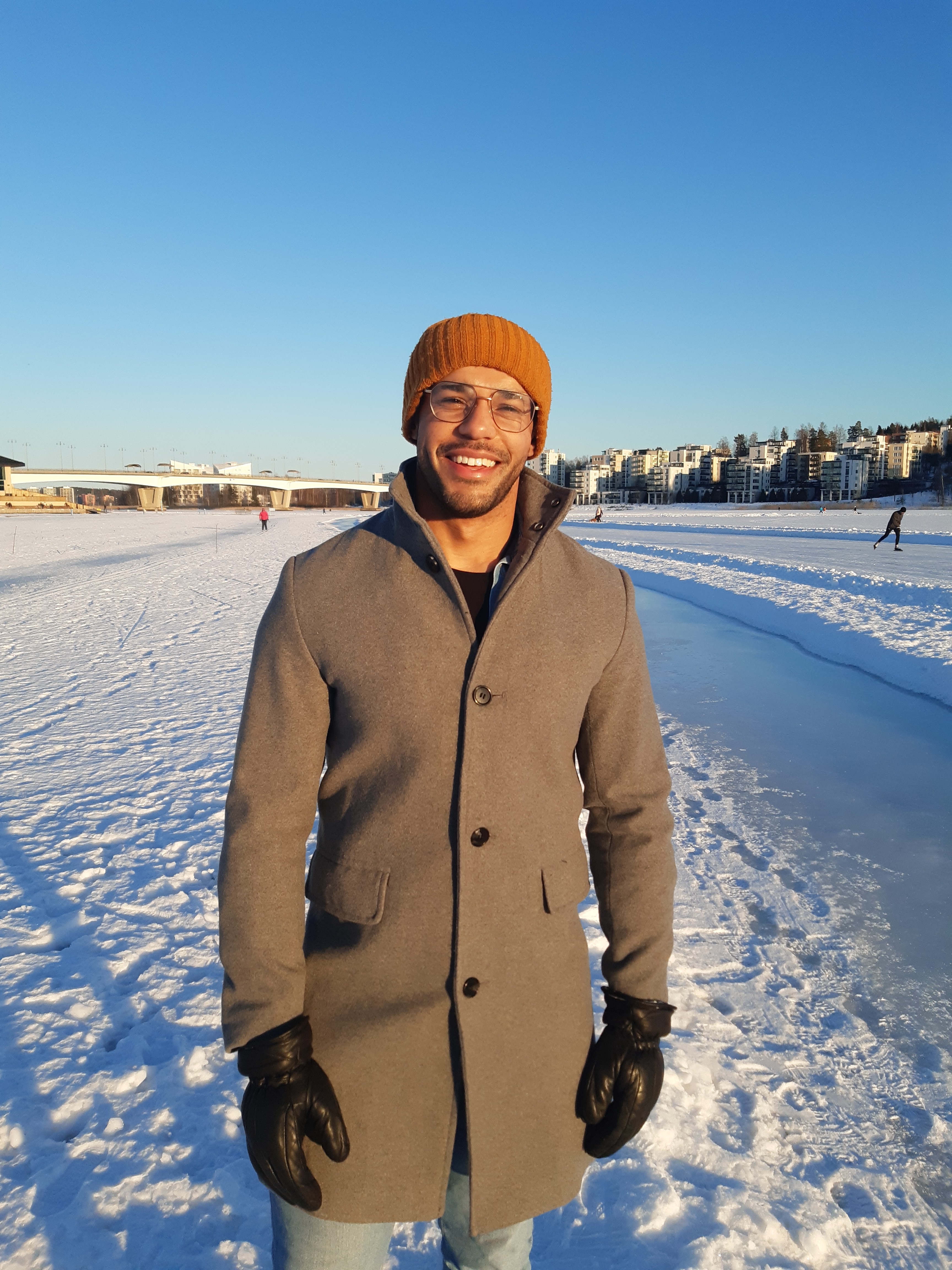 Henkilö seisoo lumisessa maisemassa. Hänellä on päällään ruskea takki, hanskat ja oranssi pipo. Taustalla näkyy kaupunkimaisema.
