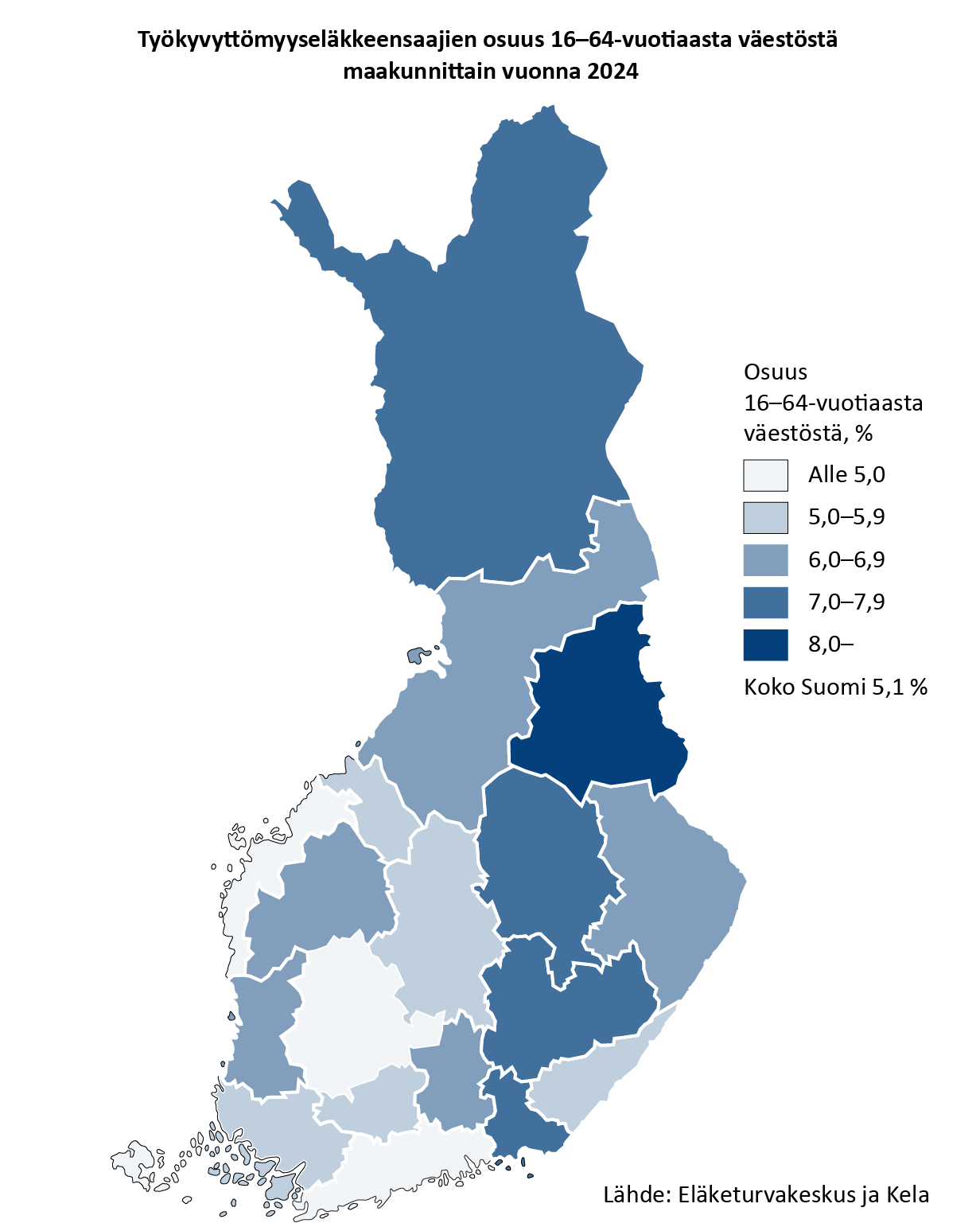 Koko maata suuremmat työkyvyttömyysluvut painottuvat Itä- ja Pohjois-Suomen maakuntiin. Eniten työkyvyttömyyseläkkeitä suhteessa väestöön maksetaan Kainuussa, jossa etuutta saa 8,3 prosenttia 16–64-vuotiaista.
