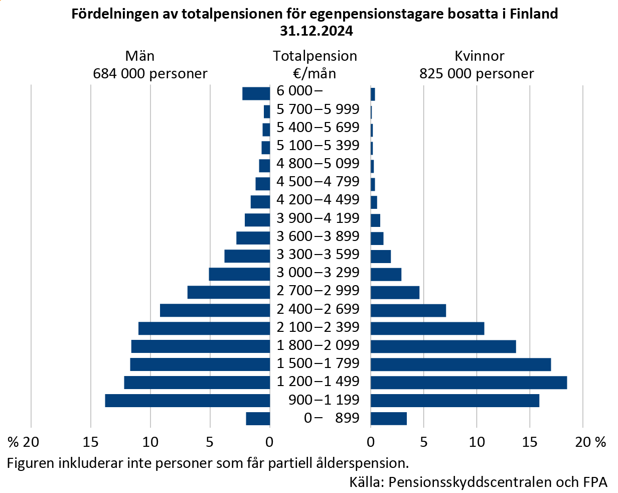 I fjol var medelpensionen 2 349 euro i månaden bland män. Kvinnornas medelpension var 1 893 euro. Hälften av männen fick en pension som översteg finländarnas genomsnittliga månadspension. Av kvinnorna fick var tredje större pension.