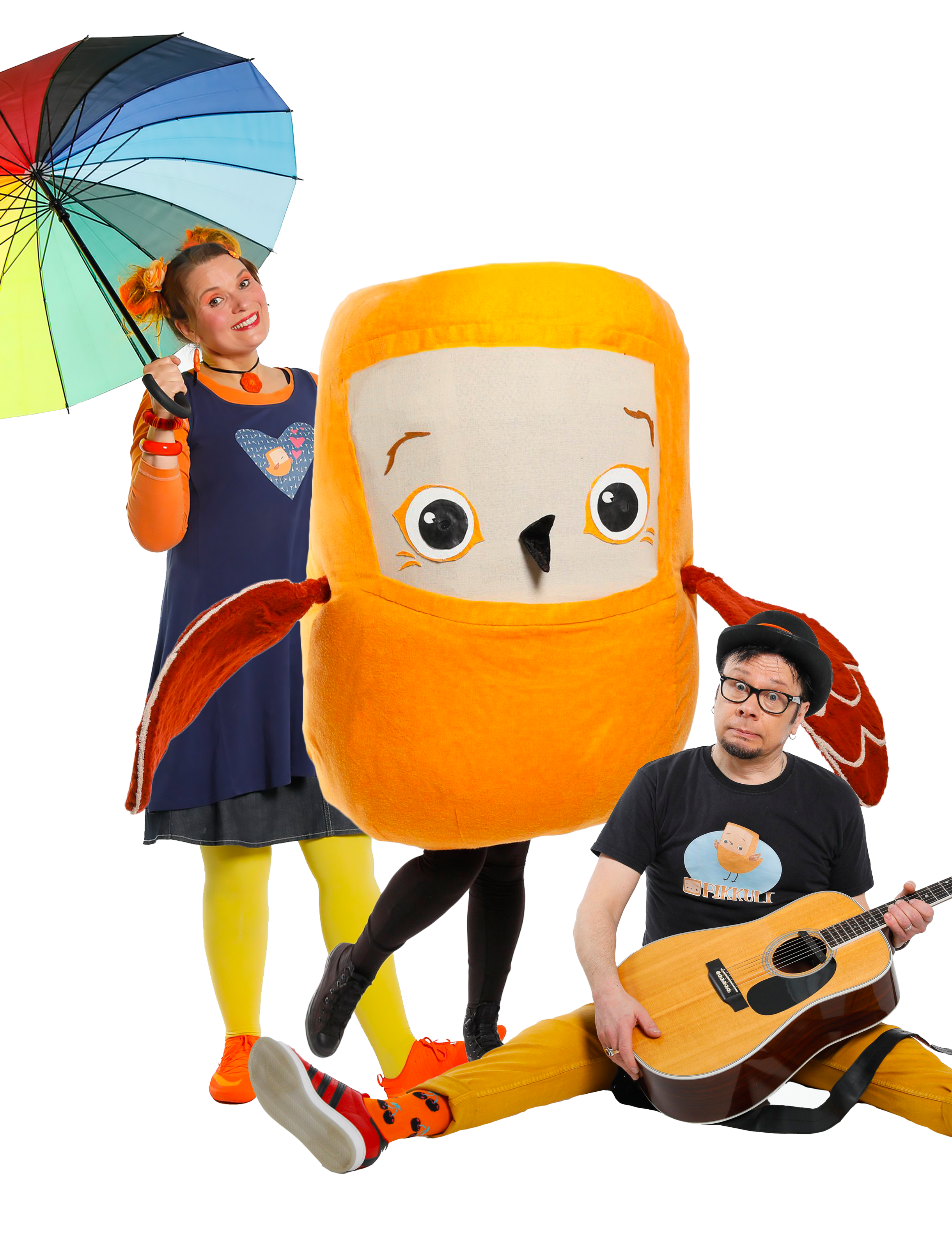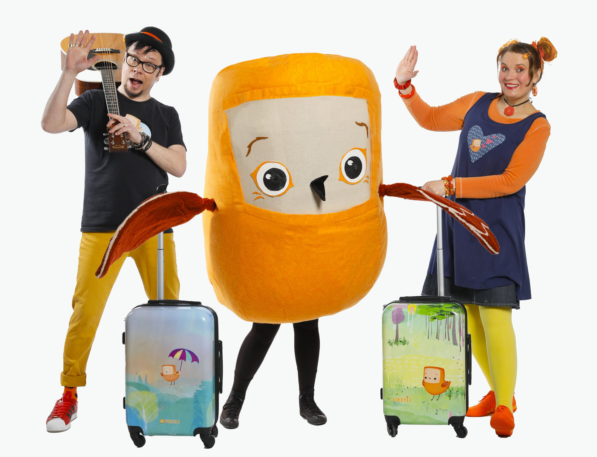 Yhteiskuva Antista, Pikkuli-maskotista ja Metsämarja. Antti pitelee kitaraa olkapäällään. Pikkuli-maskotti seisoo keskellä. Metsämarja osoittaa esittelevästi Pikkulia. Kuvassa on myös kaksi Pikkuli-matkalaukkua. Kuvan värimaailma on oranssi ja iloinen.