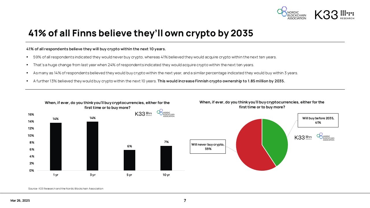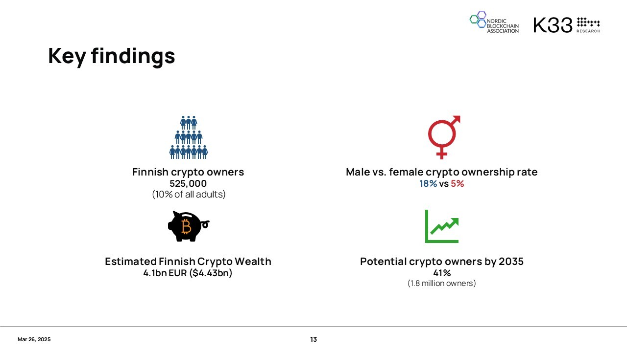 Finnish Crypto Adaptation Surveyn (3/2025) mukaan suomalaiset alle 35-vuotiaat sijoittavat jo useammin kryptovaluuttoihin kuin perinteisiin sijoitusmuotoihin. Vain 9 % 18–24-vuotiaista omistaa osakkeita (SalkunRakentaja 9/2024), mutta 24 % omistaa kryptoa.