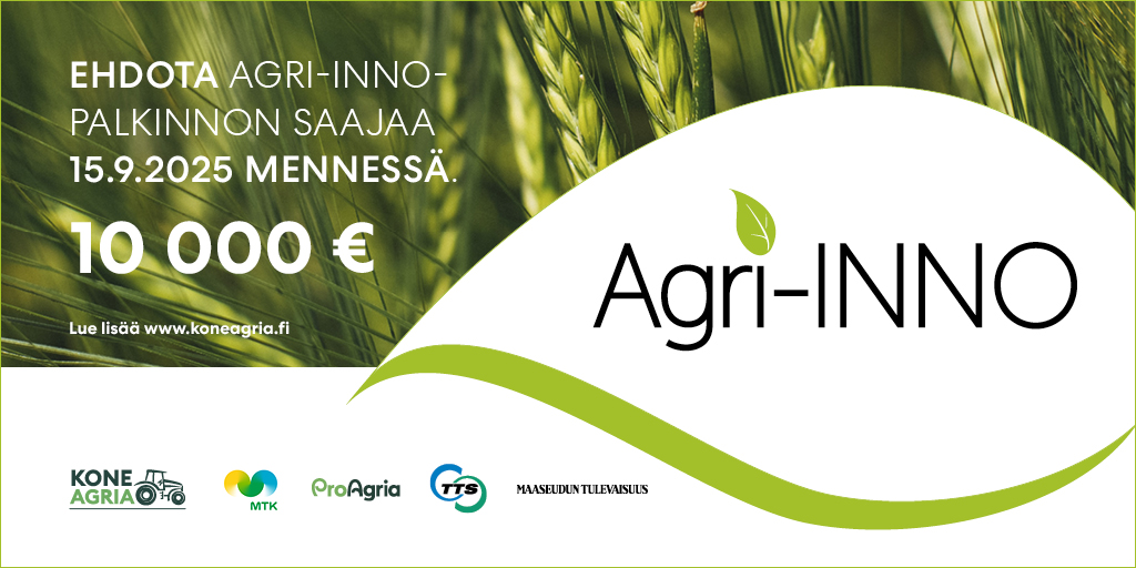 Suomen Messusäätiön 10 000 euron suuruinen Agri-INNO-palkinto jaetaan KoneAgria 2025 -tapahtumassa 9.10.2025 Tampereen Messu- ja Urheilukeskuksessa. Tapahtumassa on finaaliin valittujen innovaatioiden ideoiden esittelyt, joiden perusteella tuomaristo valitsee voittajan. Palkinnon saajaa voi ehdottaa 15.9.2025 asti.