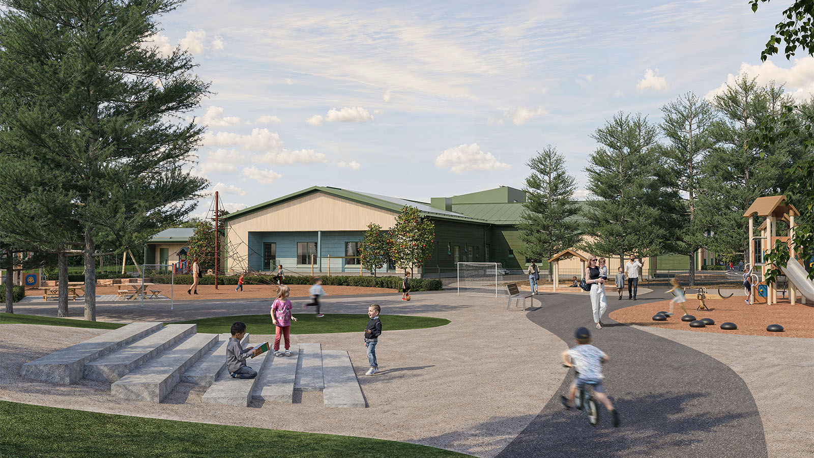 Päiväkodin arkkitehtuuri oli pitkälti suunniteltu jo kilpailutusvaiheessa. Yksikerroksinen, pääväriltään havunvihreä hirsirakennus sopii hienosti viereisen puiston vanhojen puiden rinnalle. Viitesuunnitelmaa noudattavasta rakennusten toteutussuunnittelusta vastaa arkkitehti SAFA Sakari Miettunen ja pihan osalta Susanna Rantanen.