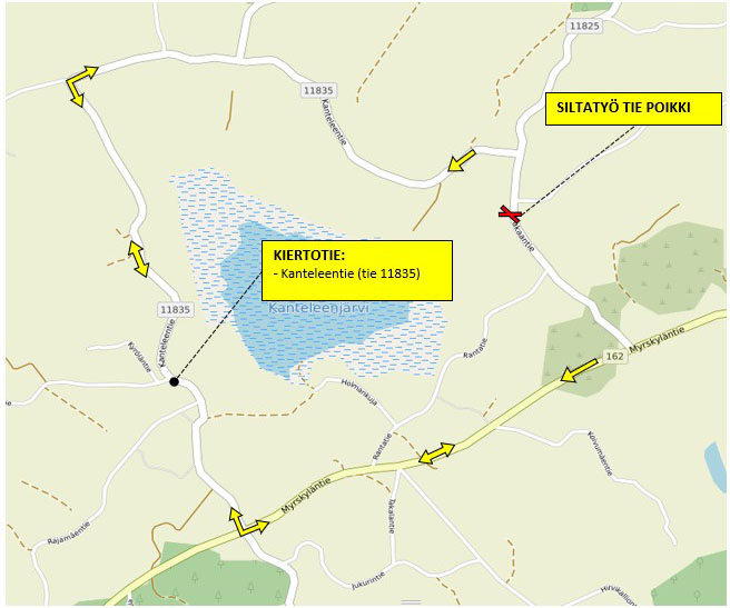 Liikenne ohjataan kiertotielle Myrskyläntien (tie 162) ja Kanteleentien (tie 11835) kautta. Kiertotien pituus on noin 7,6 km.