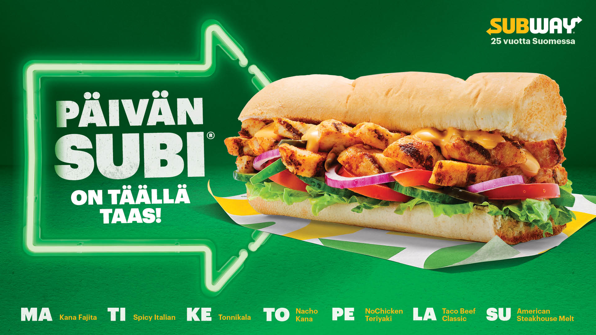 Subway® iloitsee, että aiemmin suuresti suosittu Subi®, Päivän Subi®, on tarjolla osallistuvissa Subway-ravintoloissa ympäri Suomea jälleen seitsemänä päivänä viikossa hyvään hintaan.