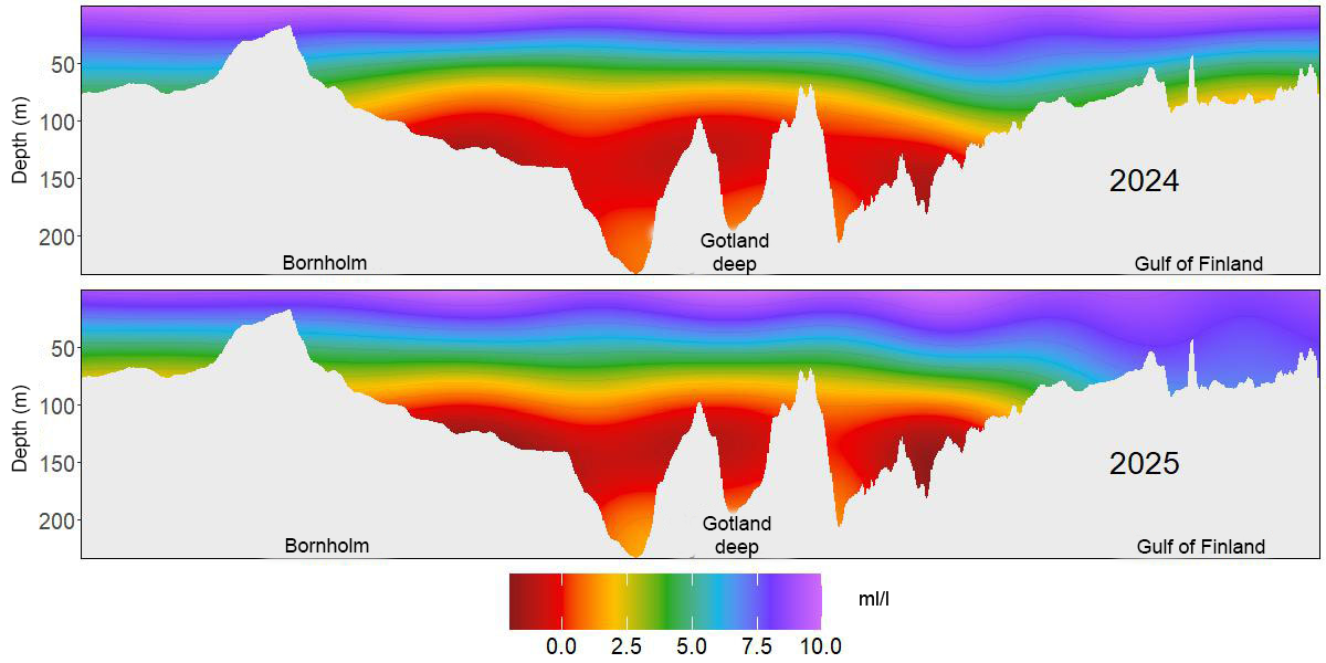 There is no improvement in sight in the poor oxygen situation that has persisted for decades in the main basin of the Baltic Sea. The water in the main basin remains anoxic below a depth of 80 to 90 metres, and the water layer depleted of oxygen extends from the Bornholm Deep to the northern parts of the main basin (Figure 3).