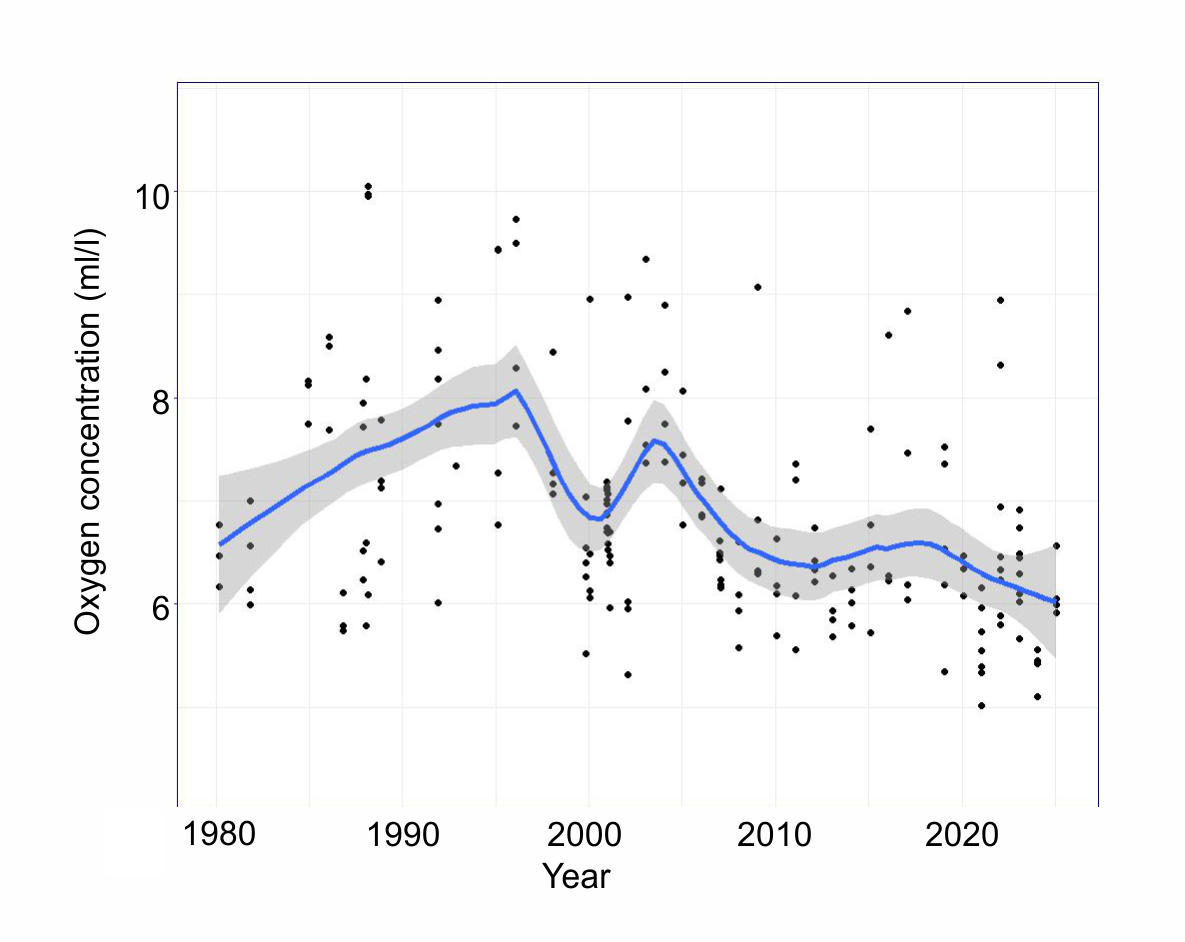 What the winters of 2020 and 2025 have in common is similar weather conditions. Winds that mainly come from a westerly direction for several months push water into the Gulf of Finland. In this situation, the halocline is lower down, the influx of anoxic water from the main basin of the Baltic Sea retreats to the west from this sea area, and the entire water mass in the Gulf of Finland can be mixed. As the weather type changes, however, the oxygen situation in the Gulf of Finland may deteriorate again relatively quickly.